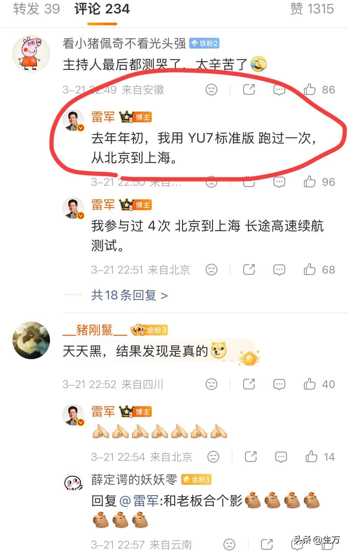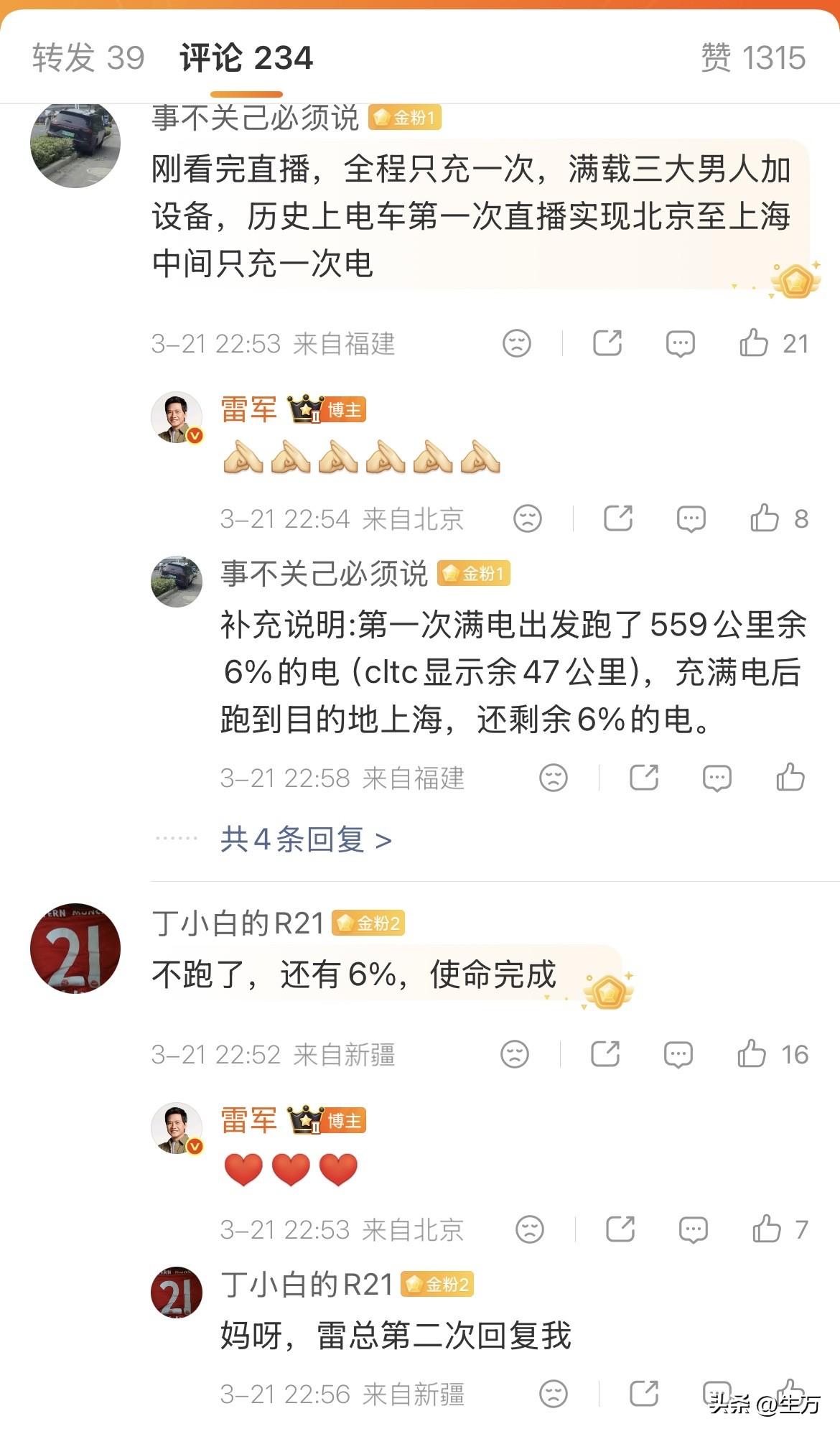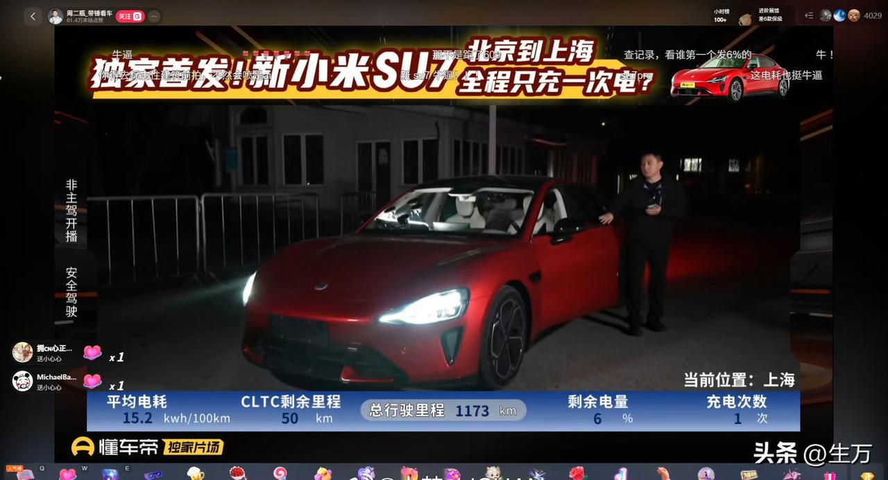 雷军:懂车帝太狠了,真的测试 新SU7“北京到上海,中间只充一次电”! 今天晚上,雷军在社交网络发了懂车帝的一个硬核操作,他们驾驶全新的小米SU7真的从北京跑到了上海! 而且这一次雷军的遣词造句也特别的严谨,因为他以前也开过北京的上海,而且他也表述过中间只充一次电,不过这次懂车帝的整体操作更加的严谨,毕竟全程都是直播的! 他们从北京开始全程直播一直没有断,整整开了1173公里,从白天开到了晚上,主持人最后都哭了,因为真的做得太久了,不过他们真的做到了,整个过程中间只充一次电,而且到了目的地之后居然还有6%的电! 有看了直播的朋友表示,如果这次懂车帝在行驶的过程中,适当控制一下脚法,那么这次他们驾驶的小米SU7 pro版本,北京到上海只充一次电,跑到1300公里应该还是连个做到的。 从昨天到今天,已经有好几个汽车媒体机构来测试小米的这几款车,得出的成绩大家都能够看得到,而且雷军都把他们的成绩给发出来了 ,在新能源汽车里面,尤其是在同价位同级别的轿车当中,全新一代的小米SU7的表现,可以说是比较亮眼的。 看来雷军对懂车帝这次的测试也比较满意,毕竟这条路他也跑过四次,所以他更加能够体会到测试团队的辛苦。