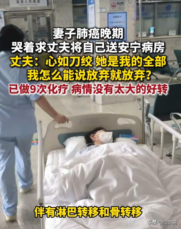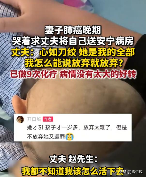 吵翻天!广西南宁,女子肺癌晚期,躺在医院的病床上非常痛苦,哭着求着让丈夫给她送到安宁病房,可丈夫却没有满足妻子的心愿,因为妻子还年轻,他还想再努努力,可这个举动,却被一些网友看作是自私。 病房窗外的木棉花开得正旺,可屋里的气氛,却压抑得让人喘不过气,病床上躺着一位女子,她患上了肺癌晚期,病情来得又急又猛,已经出现了淋巴转移和骨转移,手术做不了连化疗都推了9轮,病灶一点没控制住,身体反倒被折腾得垮了大半。 日复一日的病痛折磨,让她彻底扛不住了,监护仪的滴答声从未停歇,她满头是汗,疼得浑身蜷缩,哪怕咬着嘴唇,眼泪也顺着鬓角往下淌,那种钻心的痛,外人根本体会不到,到最后她实在撑不下去,哭着求丈夫送她去安宁病房,只求能少一点痛苦,体面地走完最后一段路。 她不是一时冲动,而是早就想清楚了,丈夫为了照顾她,已经好几个月没上班,整天守在病床前,头发乱糟糟的,眼里全是红血丝,整个人都熬得没了模样。 家里的钱像流水一样往外花,全都投在了她的治疗上,可病情一点起色都没有,她不想再拖累丈夫,不想让这个家被自己的病痛彻底拖垮。 可丈夫却始终不肯点头,他怎么都过不了自己那道坎,在他眼里妻子还那么年轻,他们的孩子才1岁多,刚会扶着沙发站起来,还没好好看看这个世界,他不甘心就这么放弃。 他还抱着一丝希望,总觉得万一有新的治疗方法,万一再撑一撑就会有转机,所以哪怕妻子哭得撕心裂肺,他也不肯松口,坚决不送她去安宁病房。 他不是不爱妻子,恰恰是太爱了才不敢放手。他怕自己一旦点头,就真的再也没有机会和妻子相守,怕往后余生每一个深夜都会后悔,当初要是再坚持一下,是不是就会不一样,他攥着妻子的手,死死不肯松开,像是一松手就会永远失去她。 这件事被传到网上后,瞬间引发了全网争论,吵得不可开交,网友们分成了两派,各说各的理,有网友骂丈夫自私,说他明明知道妻子有多痛苦,却只顾着自己的执念,用爱的名义逼着妻子继续承受无意义的折磨,根本没考虑过妻子的感受。 可也有网友替丈夫说话,觉得没人能轻易亲手送走自己最爱的人,他的拒绝不是自私是不甘心,是舍不得,换成任何一个人,面对即将失去的爱人,都很难做到坦然放手,那个“万一”,就是他撑下去的全部勇气,哪怕希望渺茫,也想再拼一次。 两拨人吵得面红耳赤,谁也说服不了谁。有人说病人有权决定自己最后一段路怎么⾛,丈夫的坚持,本质上就是自私,也有人说丈夫的不舍,是普通人最真实的执念,不该被轻易指责。 其实没人知道,病房里的两个人,都在承受着常人难以想象的痛苦,妻子疼的是身体,是想体面退场却不能,丈夫疼的是心里,是明明知道妻子在遭罪,却还是抱着一丝希望不肯放手,怕自己一松手,就留下一辈子的遗憾。 这场争吵从来都没有对错之分。网友们站在旁观者的角度,说得头头是道,可真正身处其中的人,那种两难和煎熬,只有他们自己能懂,丈夫的拒绝不是自私是舍不得,妻子的恳求,不是软弱,是实在扛不住了,这场吵翻天的争论,说到底不过是大家对“爱”的理解不一样,可没有人真正问过,病房里的两个人,到底想要什么。