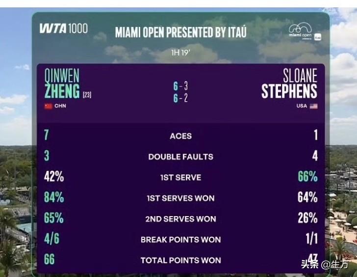 这是好事儿,郑钦文晋级迈阿密第三轮! 在今天凌晨结束的比赛当中,很久没有回归赛场的成绩的郑钦文,用一个漂亮的6-3 6-2,拿下来斯蒂芬斯,打进迈阿密女单第三轮。 前段时间大家也能感觉到,她受伤之后状态起伏还是比较大的,所以现在看来,她应该是恢复得比较不错了,由于很久都没有比赛了,所以现在他的排名相比,以前滑得比较多,不过今天晚上赢了之后,她能够拿到65分,再加上61865美金,比较巧合的是,这次打完,他的世界即时排名,刚好超过王欣瑜,来到第32名,不过这个世界排名也确实是他这么多年以来少有的比较较低的排名。 我们从第三张图片这个技术统计两个看得出来,虽然钦文这场比赛赢了,但还是有一些潜在的问题,如果他接下来想继续赢下去的话,下一场还是需要做一些及时的调整。 比如今天,她整体的发球效率真的不是很高,再加上底线的失误真的不少,不过他的正手今天斜线和大斜线的配比明显增多了 ,之前的技术正手斜线,总是要用手硬掰效果不是太理想,今天这一场打下来,总体感觉技改是对的 ,以前她的网球更多的是利用了场地的深度,现在去逐步把宽度也利用起来,打更立体的网球,这样整体的得分效率就更高一些。 今天她之所以能够拿下比赛,说得不好听点,确实是因为对手发挥的比较差,或者说水平确实和郑钦文比起来还是有一点距离,因为对手的移动能力和整体的反应以及灵活性,是没办法和前面20位选手相比的。 虽然打到后面的时候,郑钦文整体的发球稍微找到感觉,但总体来说,下一场还得提高一下才行,毕竟他下场比赛的对手是凯斯,是一位真正的实力选手。 总之,迈阿密比赛后面基本上都是高手,所以越往后面打,就越难缠,希望郑钦文的风格还是以前一样,遇到强大的对手,他就发挥的越好。