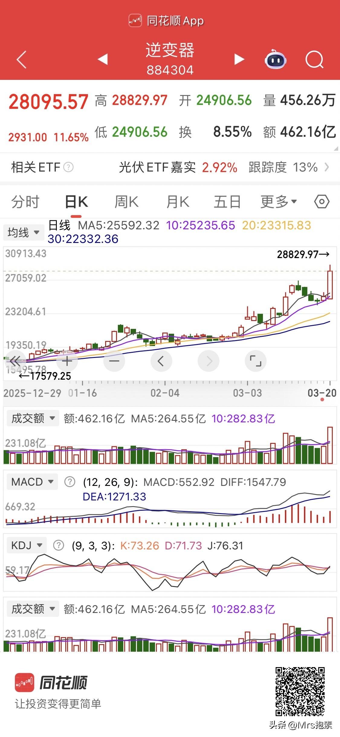 发生了什么?逆变器板块涨超11%两股20cm涨停,关注6股及操作策略 周五逆变器板块大涨,板块放巨量拉升,涨11.65%, 上能电气、首航新能20cm涨停,逆变器到底发生了什么,走势如此彪悍,股票大涨找利好,一找还真不少,具体如下: 一、大利好叠加,在累积 ·超级订单刺激:特斯拉拟采购29亿美元光伏设备,设备制造、高效逆变器、储能PCS是重点采购品类 ·国内需求强劲:央企集采集中落地 中国电建 31GW 组件集采落地,华建集团集采落地,1-2月光伏新增42%、储能182%,3月组件排产环比增长28%-29%。 • 政策继续加码:工信部《节能装备方案》,光伏强制能效标准落地,低端出清、龙头盈利修复。 ·储能大爆发:2026年全球储能装机预计+60%+,逆变器厂商从设备商转向光储融合方案商。 ·市场资金新的主攻标的。AI/算力高位震荡,资金回流超跌、业绩反转的光伏和逆变器板块。 二、持续性及操作价值 逆变器已经连续调整5个月,调整时间基本到位;需求端各种利好叠加,业绩持续改善加速;市场资金板块高低切换迫切;周五板块放巨量应该不会是短期行为。 基本判断:逆变器板块周一应该会继续冲高,如果有先手可以继续享受,如无,最高容易被套,等回调比较保靠。 三、哪些标的可以关注 其实,风来了,光伏逆变器储能产业链上的概念股都有机会,相对来说,下面几只股票机会更大,值得关注:海外弹性大的上能电气、首航新能等;户用储能龙头锦浪科技、德业股份等;光储全产业链的阳光电源、固德威等 免责声明:个人心得记录,不构成投资建议,股市有风险,投资需谨慎。 (备注:图一为逆变器板块月K线,图二为日K线)