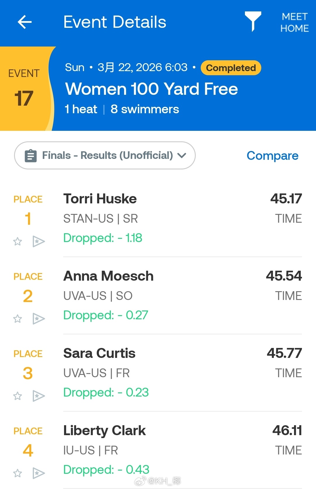 NCAA DI Women's Championships 女100码自由泳决赛,Torri Huske 45.17NCAA历史第四快成绩