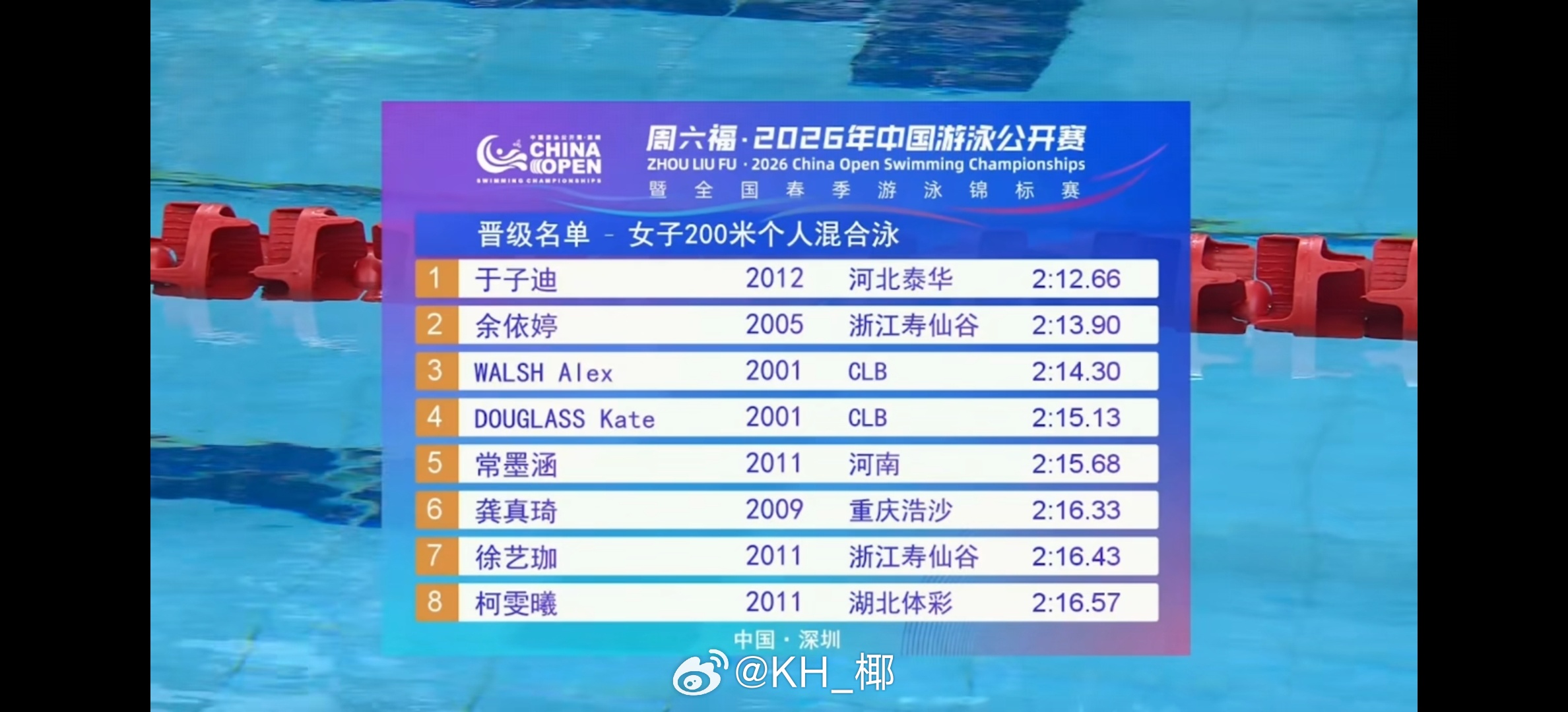 2026年中国游泳公开赛 女200混预赛于子迪 2:12.66余依婷 2:13.90🇺🇸大沃 2:14.30🇺🇸道妹 2:15.13常墨涵 2:15.68龚真琦 2:16.33徐艺珈 2:16.43柯雯曦 2:16.57任健淼 2:16.77刘梦阳 2:17.04 刘妍希 2:18.09李妍卓姗 2:19.00陈思亦 2:19.08章梦妮 2:19.17周卉然 2:19.41王艺静 2:19.63