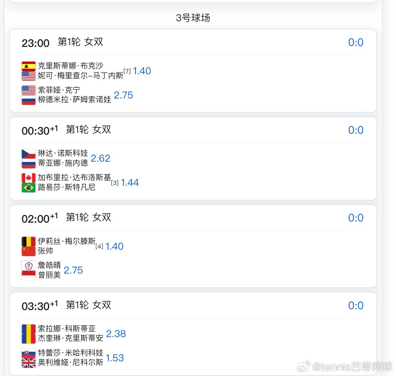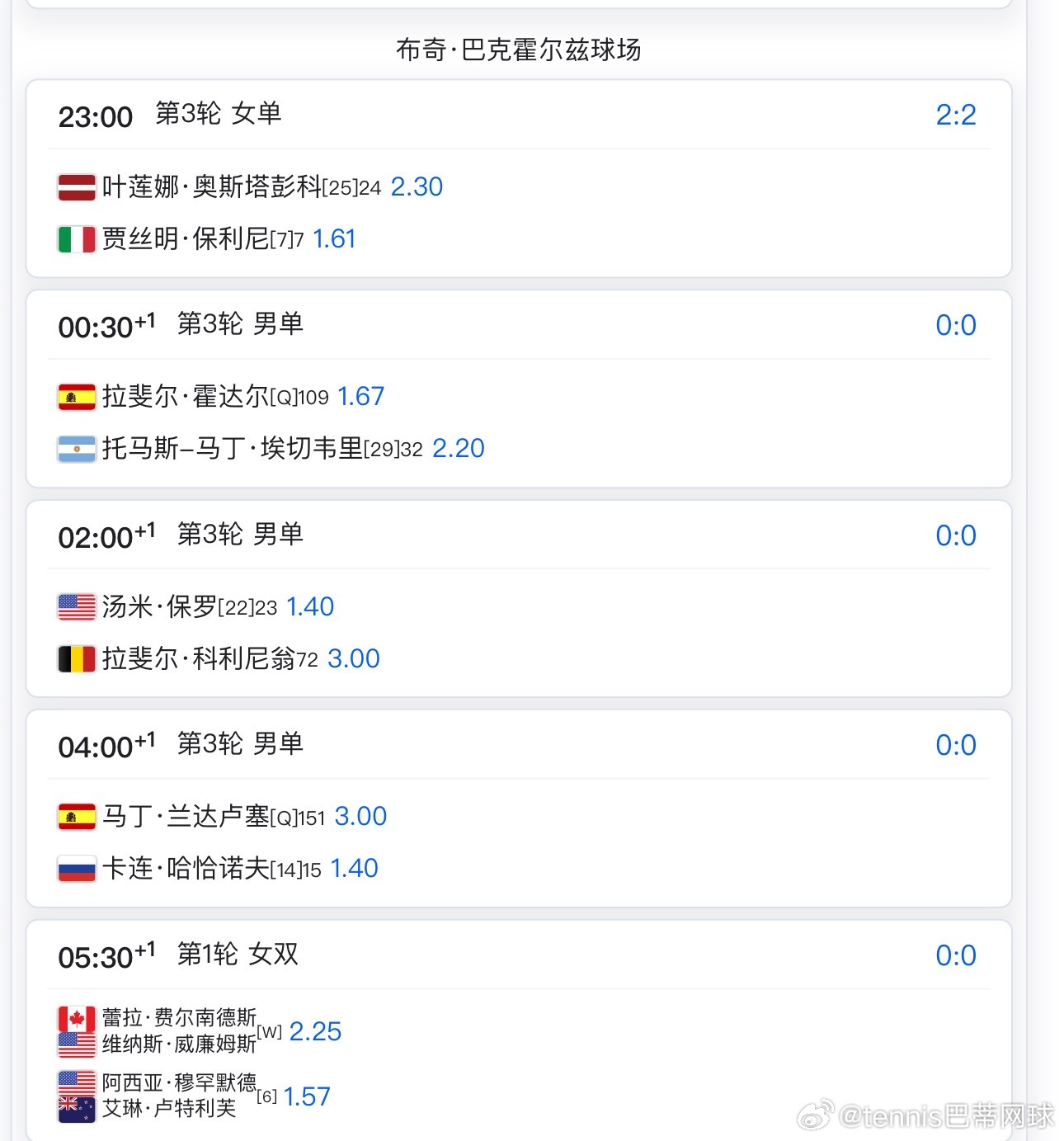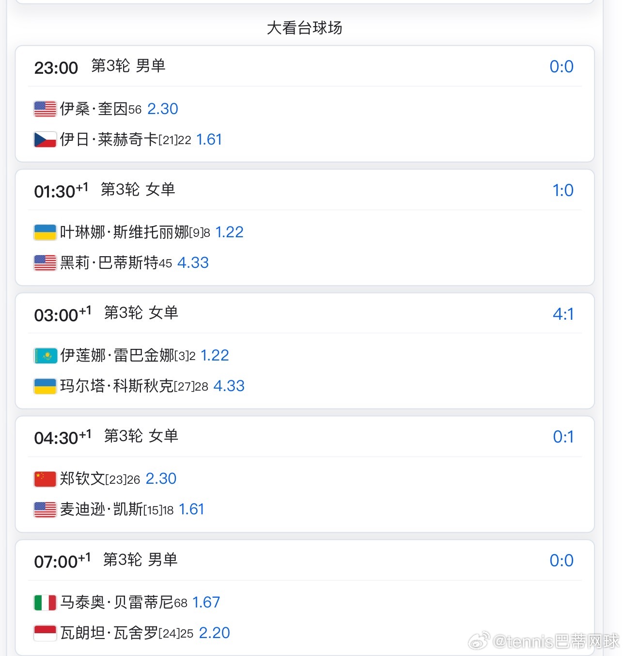 大看台球场不早于3点莱巴金娜🇰🇿vs科斯秋克🇺🇦随后郑钦文🇨🇳vs凯斯🇺🇸