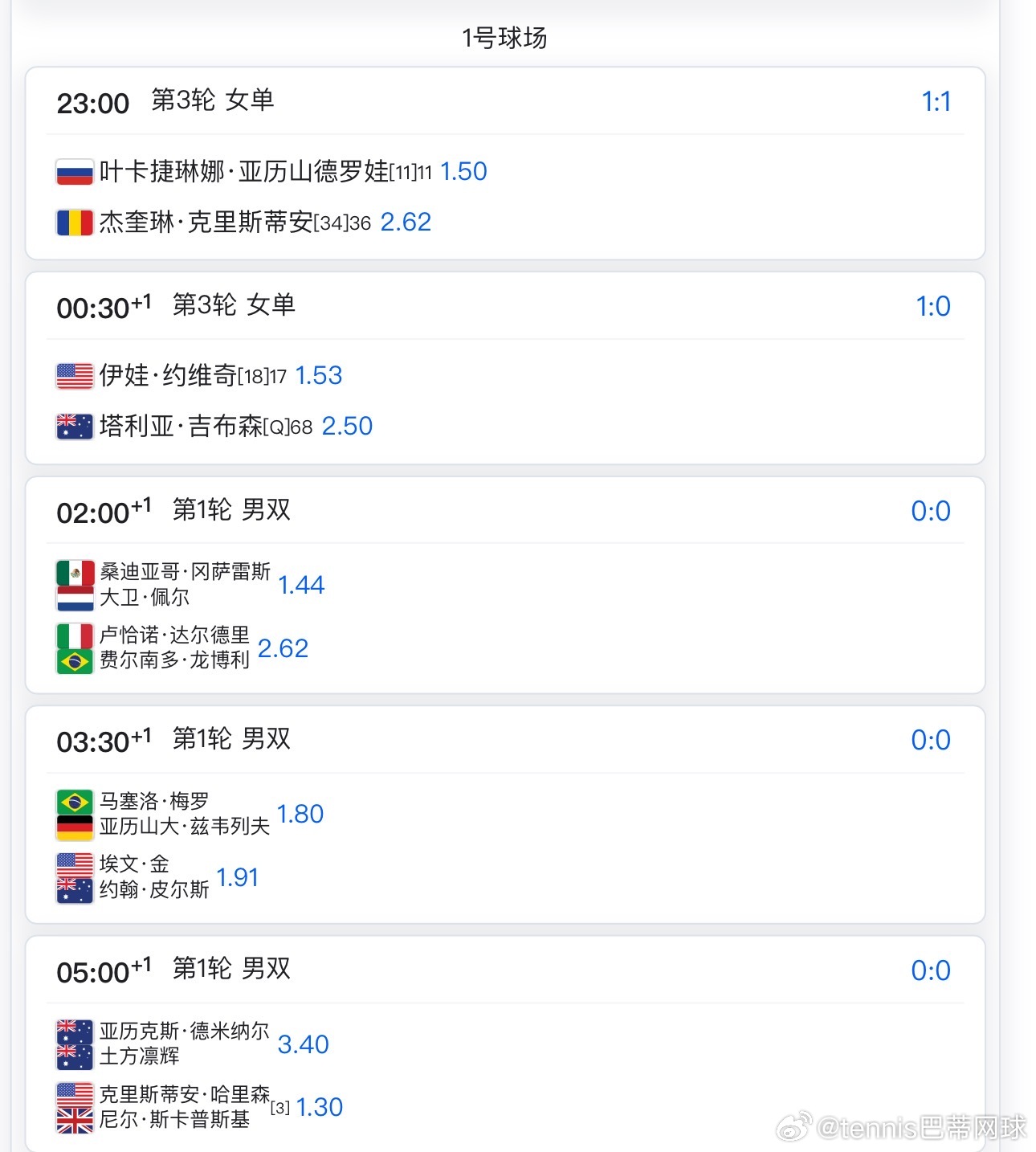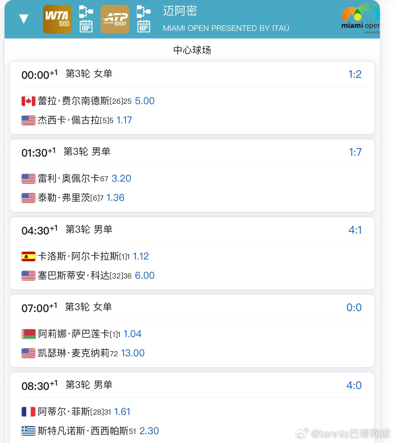 中心球场0点佩古拉🇺🇸vs费尔南德斯🇨🇦随后弗里茨🇺🇸vs奥佩卡尔🇺🇸不早于4:30阿尔卡拉斯🇪🇸vs科达🇺🇸不早于7点萨巴伦卡🇧🇾vs麦克纳利随后西西帕斯🇬🇷vs菲斯🇫🇷