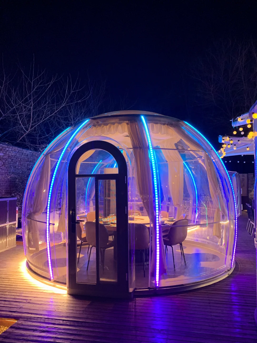 全景透明设计,里面带空调,一年四季都不冷,空间超大,一桌能坐8-10人,不只有超美的星空房,还有能坐20人的宽敞大包间,也有适合4-6人的私密小间,家庭聚餐、朋友团建、商务宴请都特别合适~