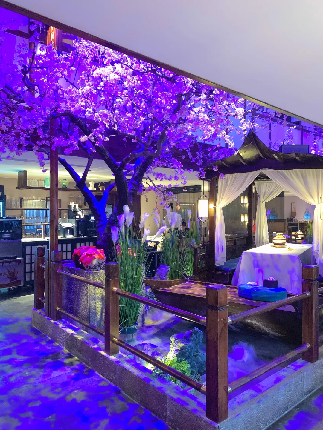 古风江南感,青瓦小院、水雾缭绕,拍照超有氛围感~室外用餐区敞亮舒服,吃饭特别惬意!