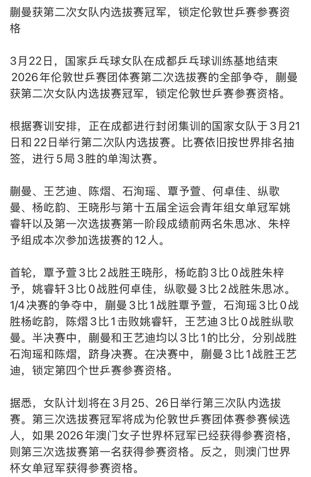 恭喜蒯曼!锁定2026 伦敦世乒赛团体赛女队参赛资格第四人! 3 月 22 日成都世乒赛团体赛第二次女队选拔赛,蒯曼一路过关斩将,决赛3-1 击败王艺迪拿下冠军,锁定伦敦世乒赛团体赛参赛资格,成为国乒女队第四位拿到门票的选手。 晋级关键战 1/4 决赛:3-1 胜覃予萱 半决赛:3-1 胜石洵瑶 决赛:3-1 胜王艺迪 目前女队已确定:孙颖莎、王曼昱、陈幸同、蒯曼,仅剩最后一个名额待决出,就看世界杯谁能把握住了,要是世界杯拿不下冠军,还得进行第三次队内选拔赛,希望大迪能把握住机会吧。 男队目前已确定:王楚钦、林诗栋、周启豪,第四和第五人咋哪儿呢?