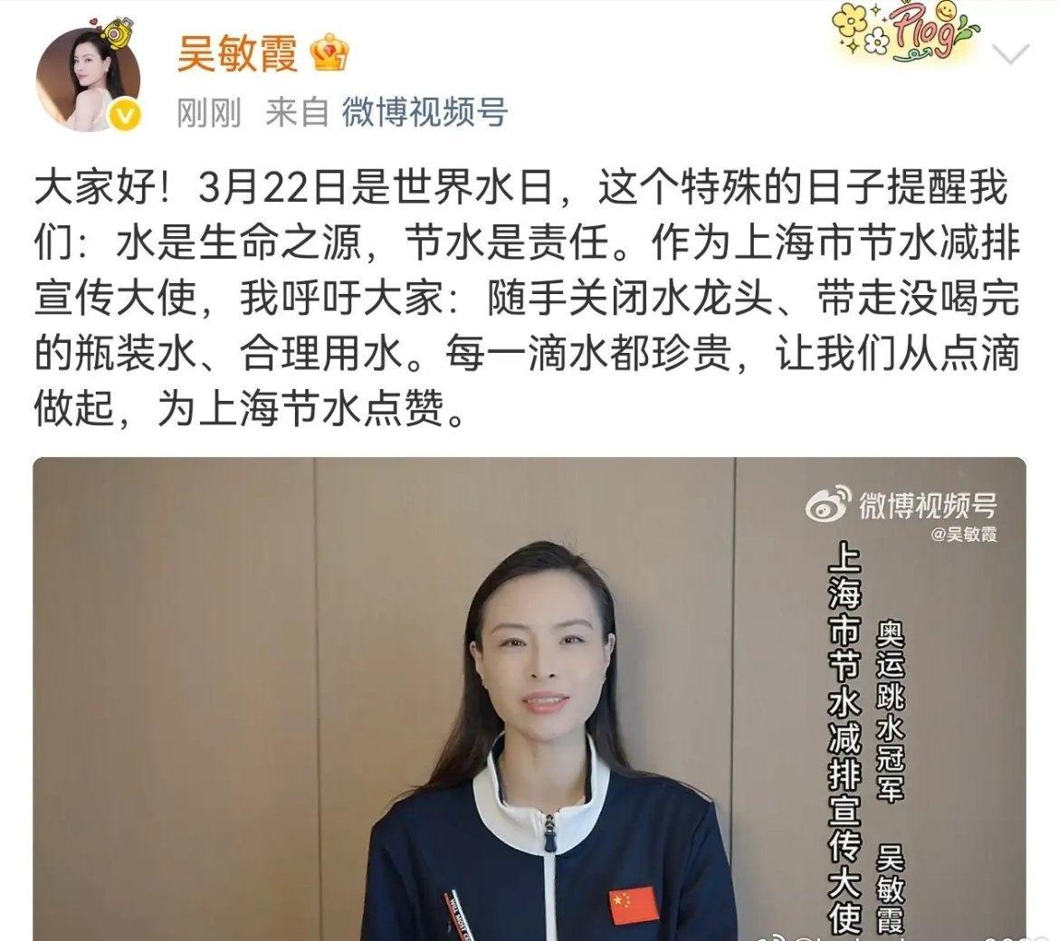 吴敏霞,高调发文! 奥运跳水冠军吴敏霞,突然在社交平台高调发文,字里行间都很严肃,甚至呼吁起了网友,这到底是怎么回事呢? 原来,今天是世界水日,吴敏霞在微博发布了一则节水宣传视频,以“上海市节水减排宣传大使”的身份,向公众发出节水倡议。 视频里,她穿着带有中国国旗的运动外套,语气亲切又有力:“水是生命之源,节水是责任。” 她结合日常场景,呼吁大家从三件小事做起:随手关闭没拧紧的水龙头、带走没喝完的瓶装水、养成合理用水的习惯。她还特意提到,每一滴水都珍贵,希望大家一起为上海节水点赞。 作为曾经在泳池里为国家争得无数荣誉的奥运冠军,吴敏霞对“水”有着特殊的情感。从赛场上与水为伴、挑战极限,到如今化身节水大使。 她把对水的敬畏从赛场延伸到了生活里,用自己的公众影响力,让更多人意识到节水不是口号,而是每天都能做到的小事。 这条微博发布后,很快引发了网友的共鸣,大家纷纷在评论区响应:“跟着冠军一起节水!”“从点滴做起,守护我们的生命之源。”