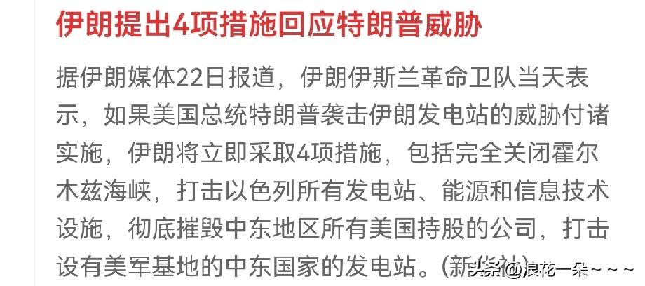 就在刚刚, 看了伊朗提出4项措施应对特朗普威胁,简直就是毫不妥协,硬刚到底。仔细看了一下这四项反制措施,我认为真的很有针对性,就是一个对等反制和报复吧? 当然也说明了伊朗有足够的能力和信心来应对特朗普的威胁。 如果特朗普真的要打击伊朗电力设施,那么按照这个回应措施来看,战火将会越烧越猛,真的是有点刹不住车了。我看有美国学者都提出来了,说美国必须“收手”,以避免整个世界遭殃。 信息来源,新华社。