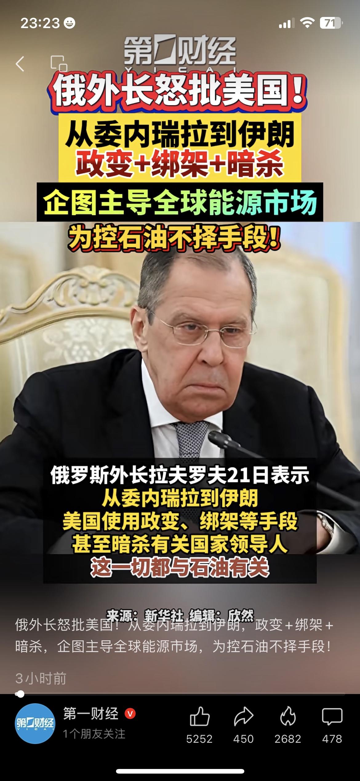 俄外长怒批美国!从委内瑞拉到伊朗,为控石油不择手段 刚看到第一财经的消息,俄罗斯外长拉夫罗夫直接怒批美国: 从委内瑞拉到伊朗,美国用政变、绑架甚至暗杀的手段,对付这些国家的领导人,一切都是为了控制石油,主导全球能源市场。 拉夫罗夫还说,美国奉行的原则就是自身利益高于任何国际协议,为了自己的目的不惜一切手段。 说白了,这就是把美国操控全球能源的遮羞布直接扯下来了。 你觉得美国这种做法,最终会反噬自己吗? 俄外长批美 全球能源 国际新闻
