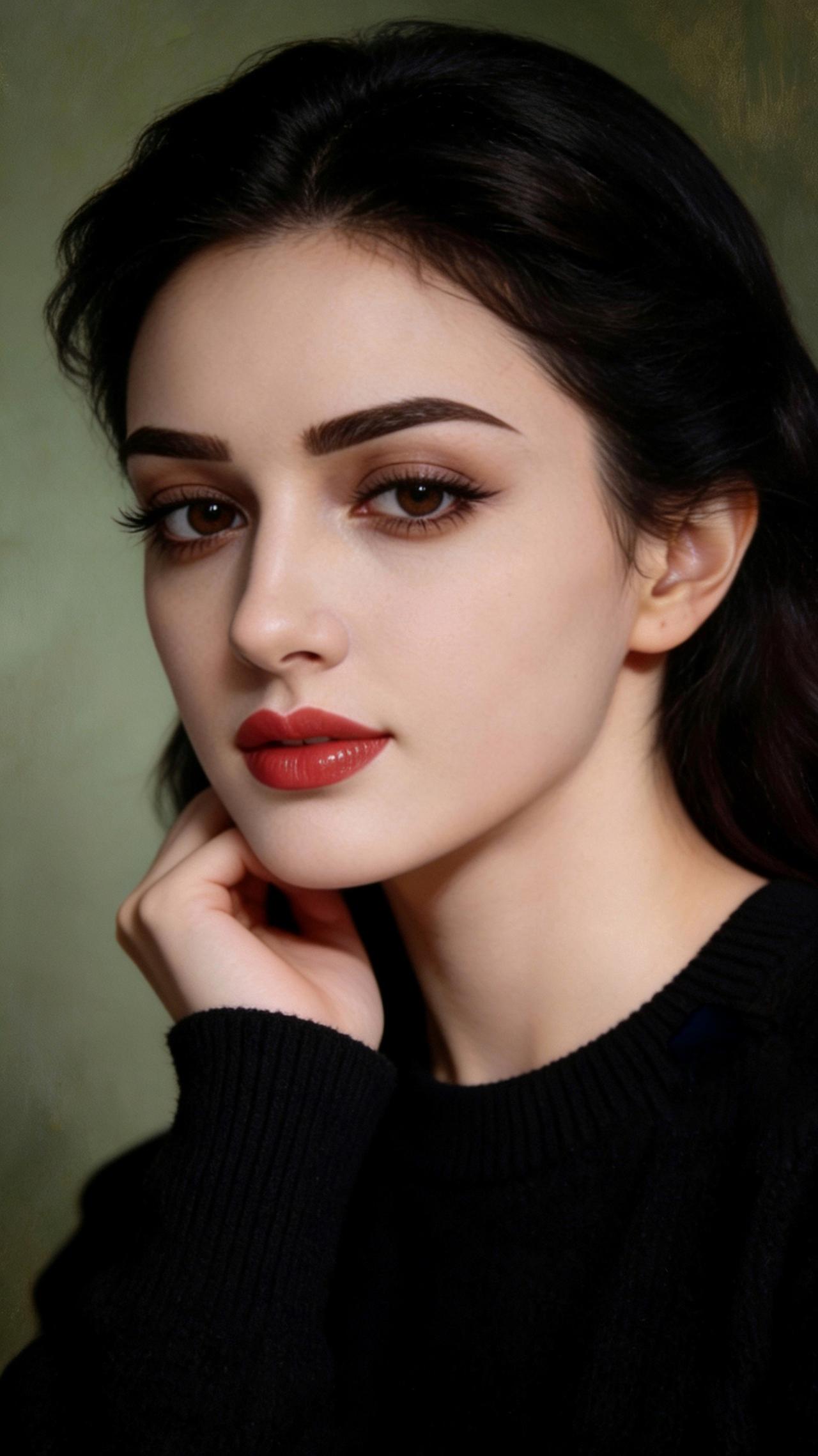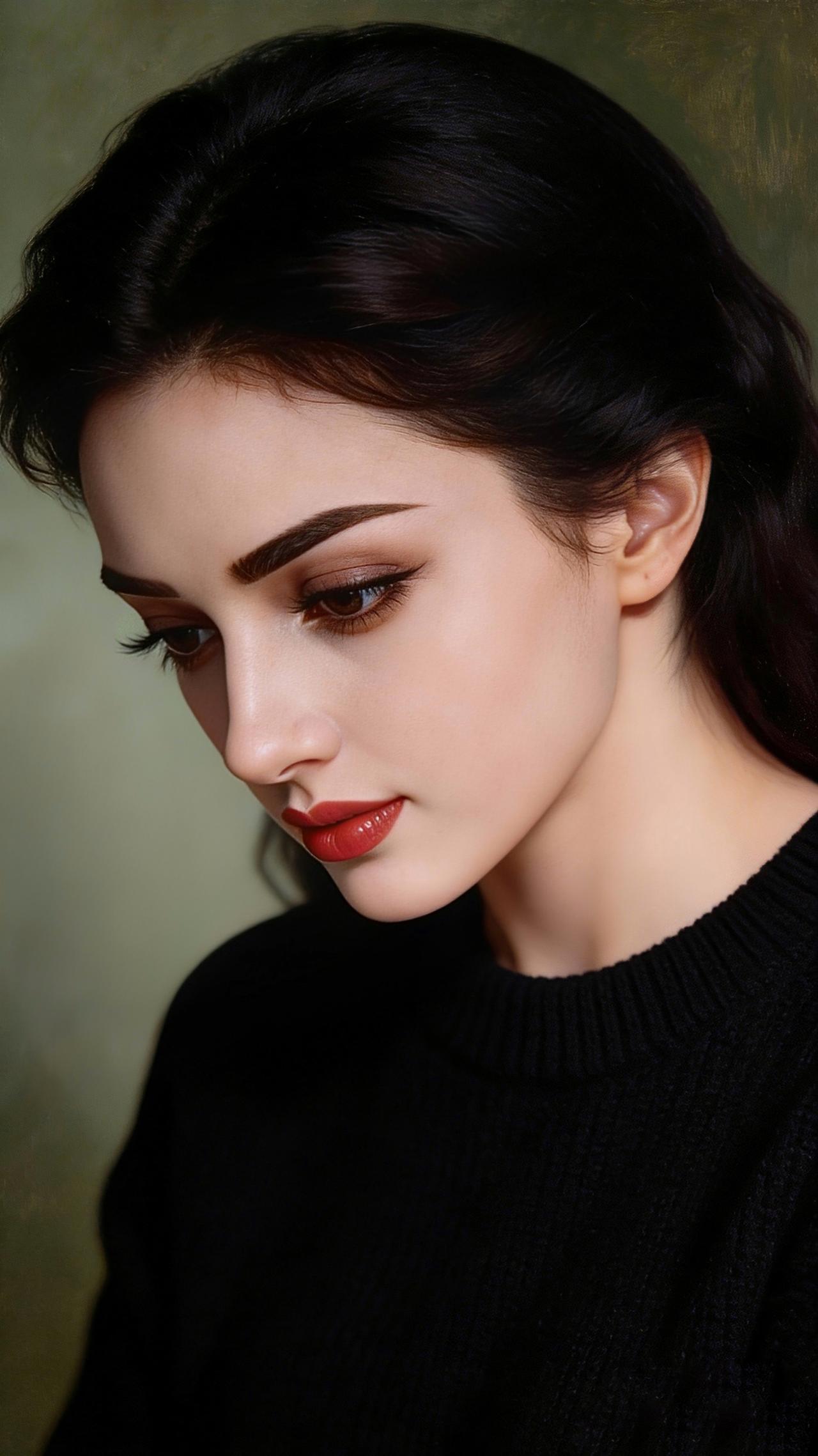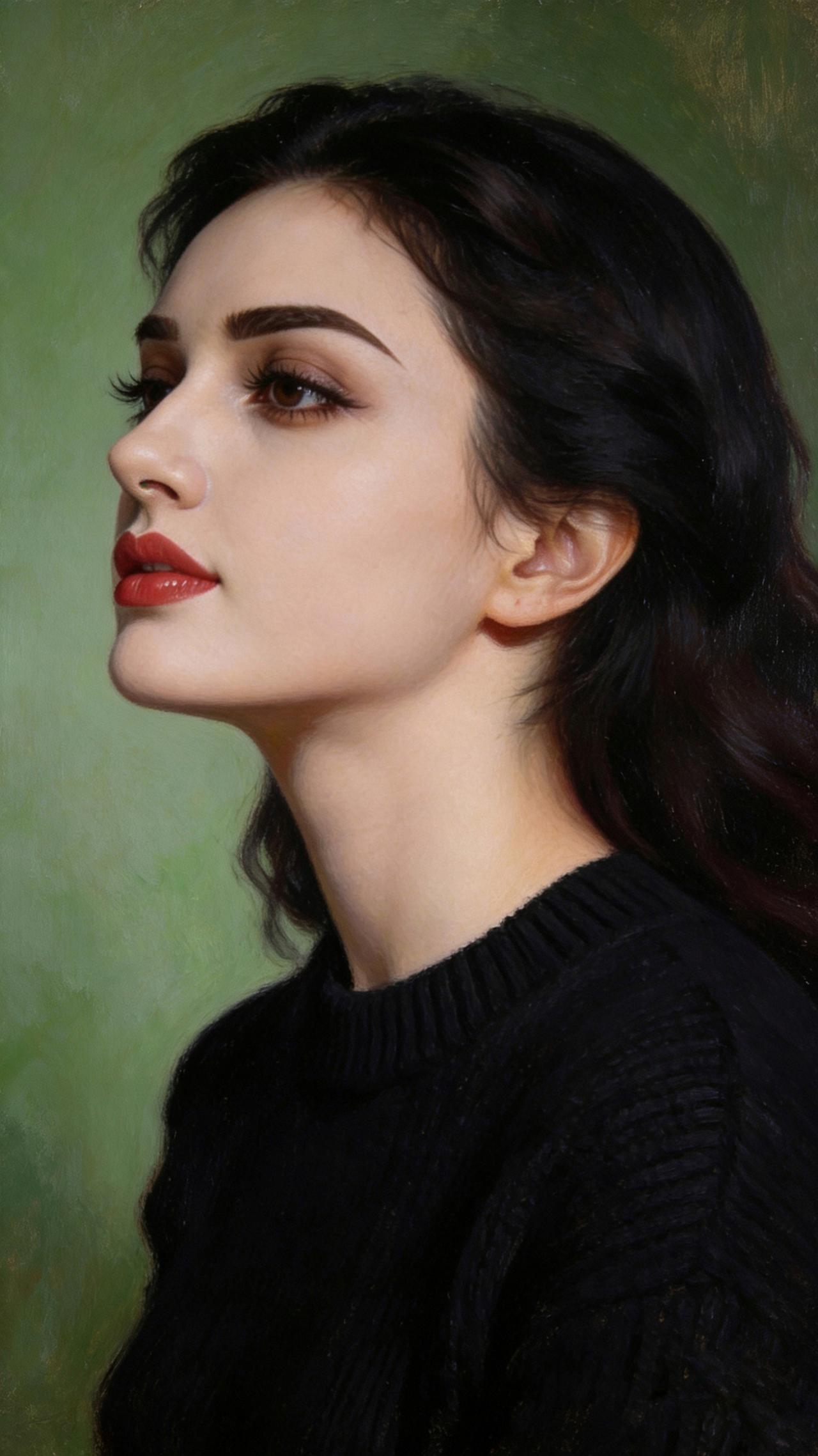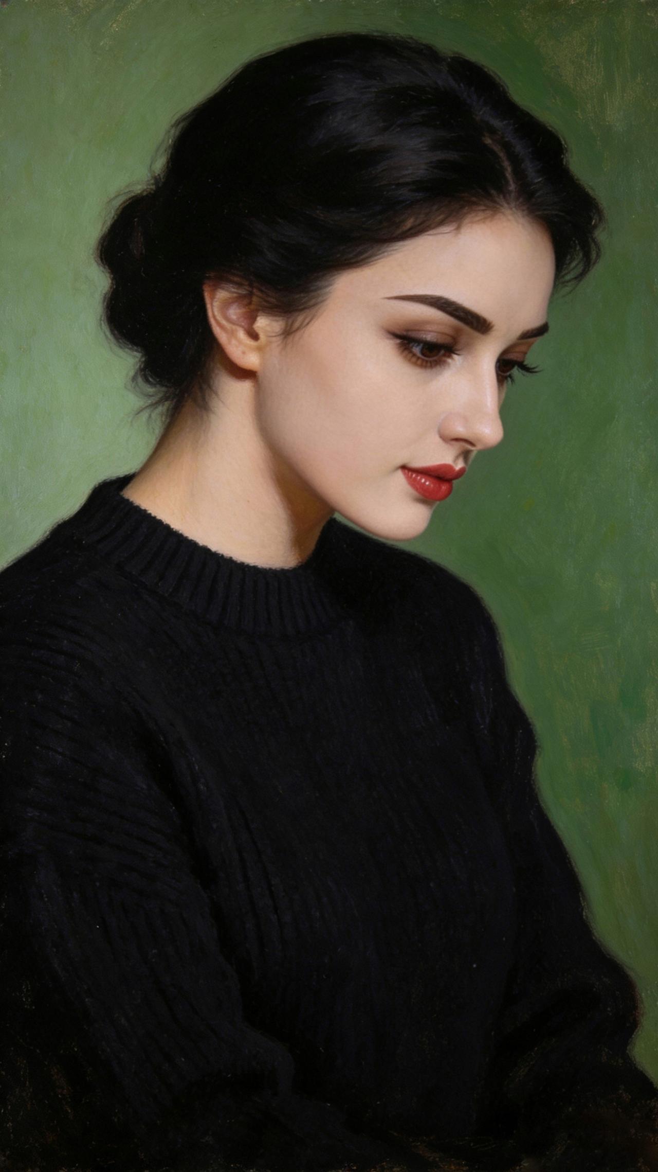 九帧同绘侧颜仙!乌发如绸垂落,眸藏星辰眼含情,红唇似焰映雪肌。黑毛衣衬温婉,绿调背景织静谧,油画质感漫帧间。这东方知性美,一眼沦陷心尖! 图片为A l辅助完成,请注意甄别!