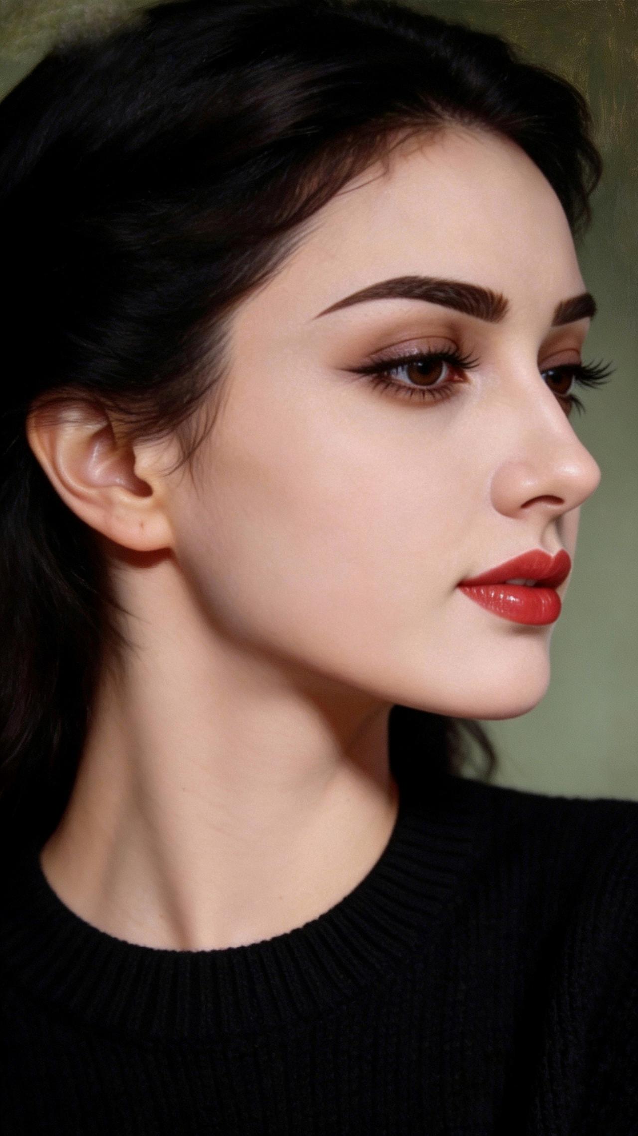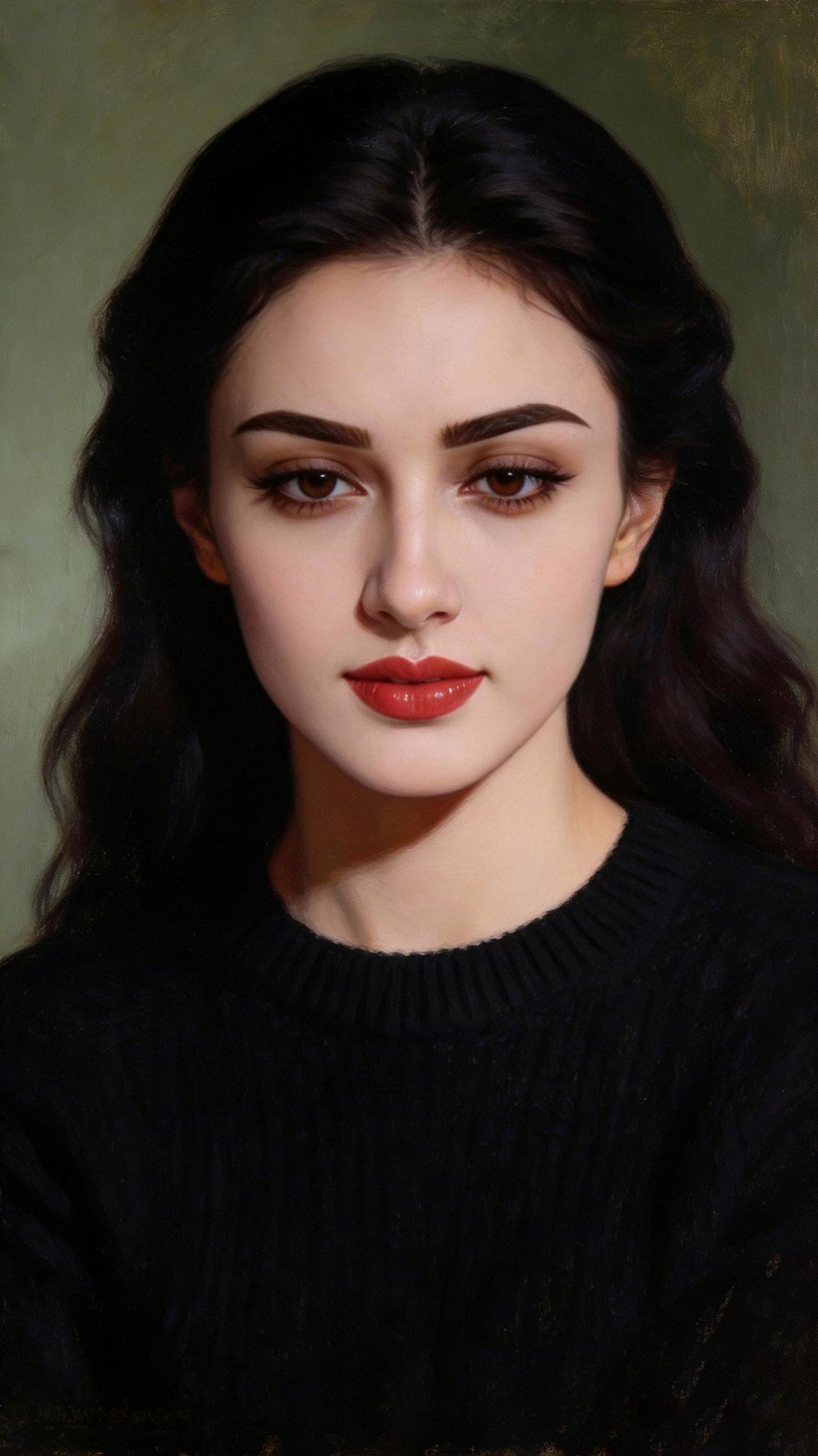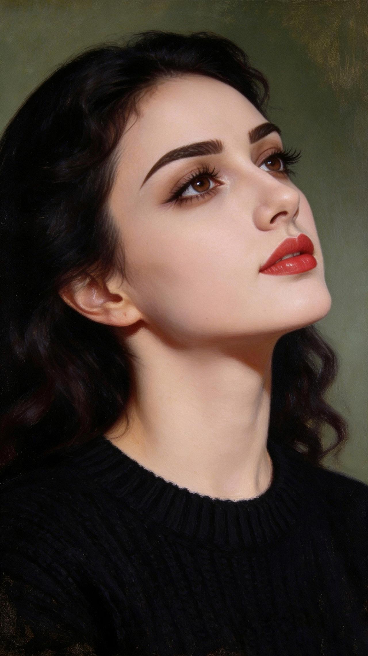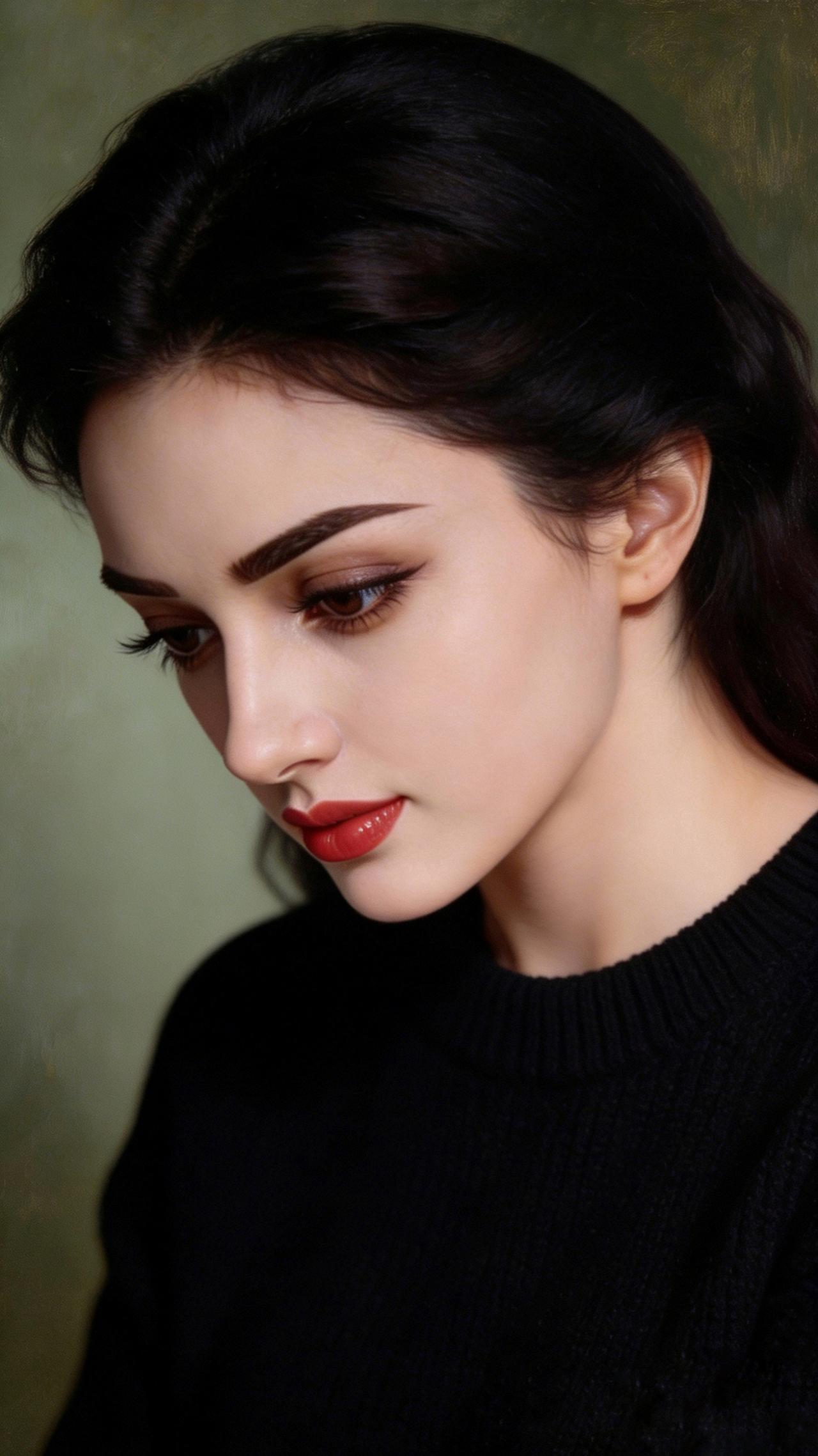 九帧同绘侧颜仙!乌发如绸垂落,眸藏星辰眼含情,红唇似焰映雪肌。黑毛衣衬温婉,绿调背景织静谧,油画质感漫帧间。这东方知性美,一眼沦陷心尖! 图片为A l辅助完成,请注意甄别!