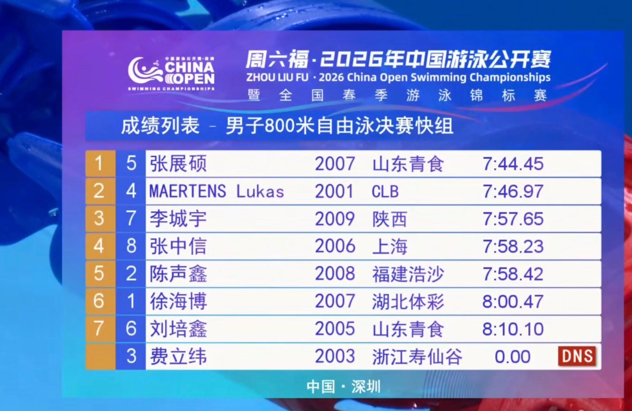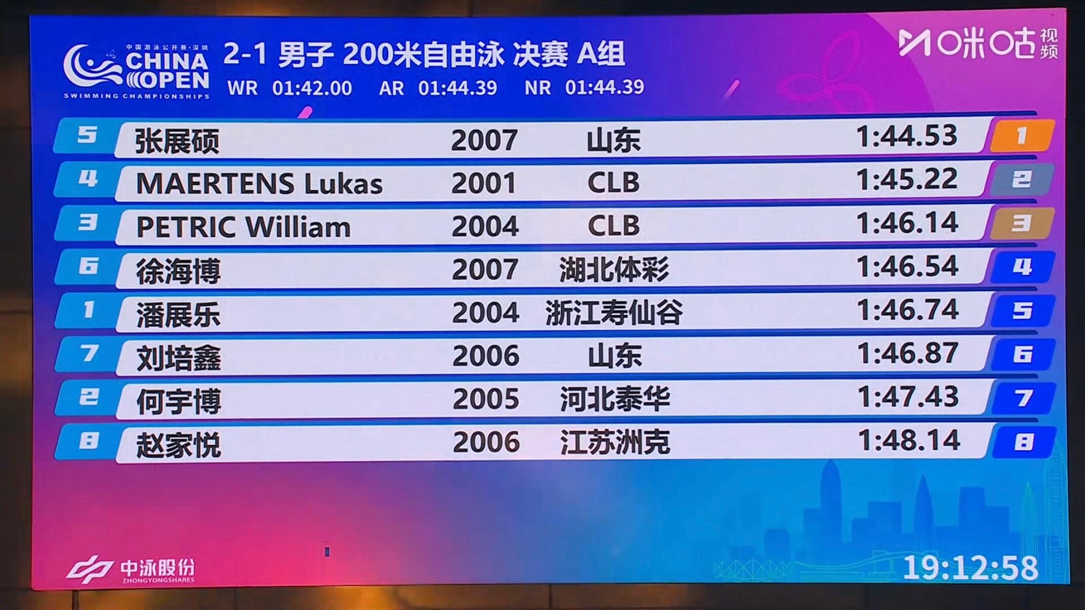 张展硕中国游泳公开赛四项四金四PB,并且三项都超过马滕斯(400自世界纪录保持者)