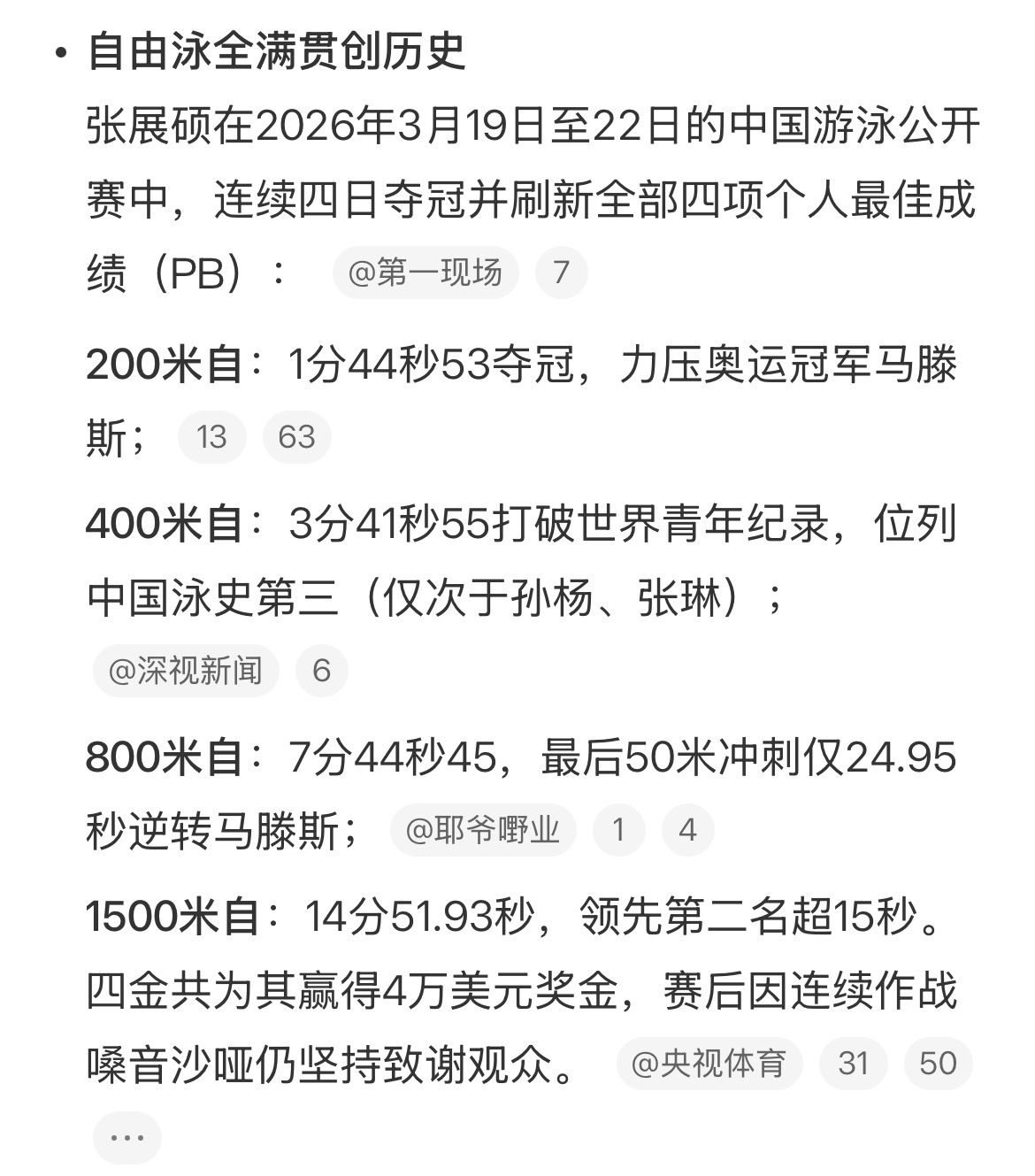 woc泳队梯队建设发力了洛杉矶真的有希望了张展硕中国游泳公开赛四项四金四PB,并