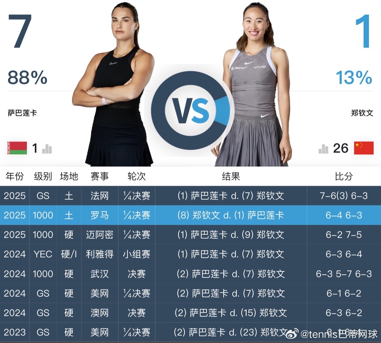 ✅这是双方第9次交锋,萨巴伦卡7:1领先于郑钦文✅这也是郑钦文本次迈阿密连续碰到的第三位大满贯冠军,这次更厉害,还是世界第一,头号种子✅萨巴伦卡是卫冕冠军,自澳网决赛以来保持全胜(8连胜)
