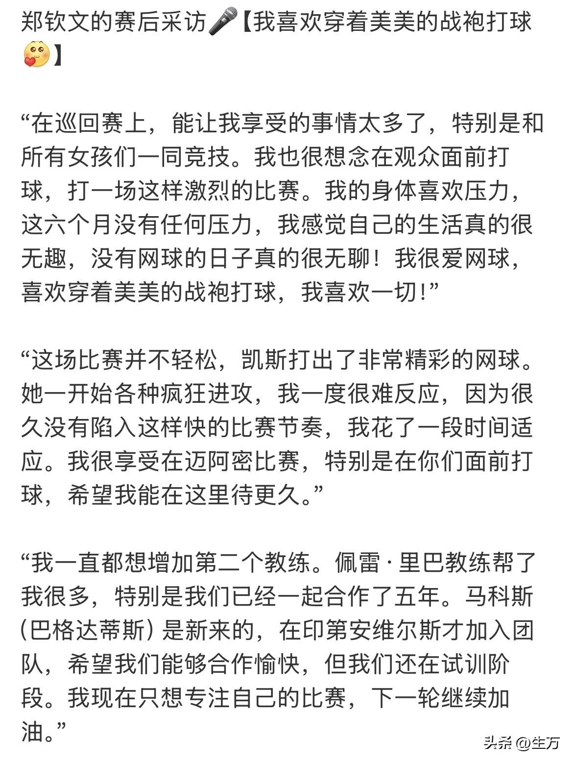 郑钦文赛后采访:里巴教练帮了我很多,特别是我们已经一起合作了五年! 很久没有连续拿到胜利的郑钦文,今天终于逆转艰难的战胜了老对手凯斯,他在赛后接受裁判的时候,专门谈到了三个方面的内容: 首先就是大家关心的,一段时间都没拿到比较好的成绩,所以他自己考虑到,是不是要再请一个教练在团队来,让自己的技术短板能够得到补充,因此他专门强调了与自己已经合作了五年的老教练巴的重要性,同时也强调了与新教练马科斯现在还在处于磨合阶段。 其实就是今天比赛的本身,看过今天这场比赛赛的朋友都有这种感觉,第一盘的时候,他还是被对手牵制着,因为对手的进攻方式确实比较多样,再加上第一盘的时候他的一发成功率也不是很高。所以他自己好像信心都不是特别强,但是到第二排第三排的时候,他的自信慢慢地回来了,尤其是现在他的反手确实明显有进步,但同时不得不说,失误还是存在的,这方面依然需要进步。 因为接下来他要打的对手,大概率可能是萨巴伦卡,所以必须自己要尽可能地少犯错误才行,这也谈到了自己大概有差不多半年的时间,没有这种比较高压的比赛方式,所以他需要通过这种方式让自己的心理和身体得到正向反馈,这也是他喜欢网球这项运动的根本原因。 现在已经进入16层了,越往后面把,尤其是下一场,如果真的碰到萨巴伦卡的话,把自己能够做好的做好,尽可能的少失误,提高一发成功率 。