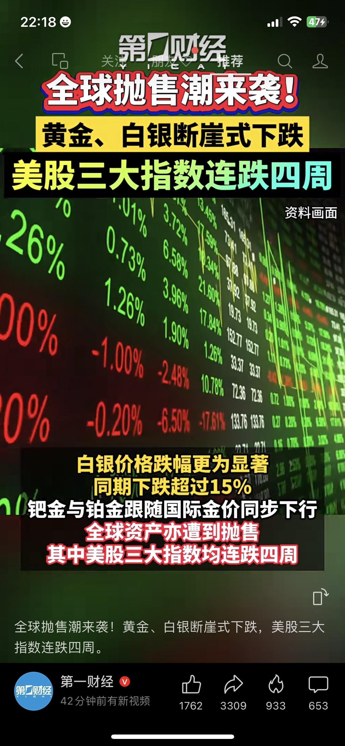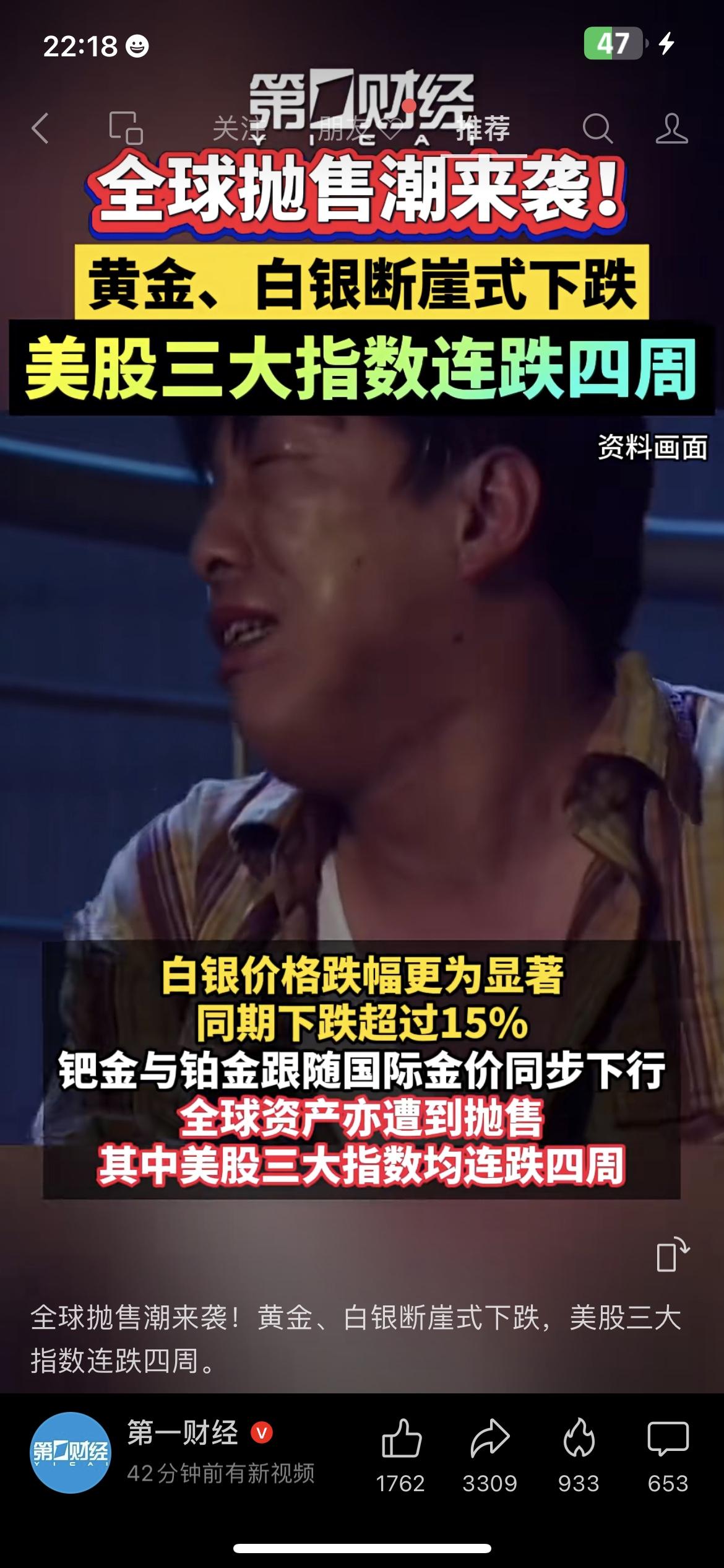 黄金单周跌10.49%创43年最大跌幅!美股连跌4周,你的钱还好吗? 第一财经刚爆消息,全球资产大抛售真的来了! 伦敦金现货周跌幅达10.49%,创下1983年3月以来最大单周跌幅,白银更是直接跌超15%,连美股三大指数都连跌了4周,钯金、铂金也跟着跳水。 我闺蜜上周刚跟风买了黄金ETF,今天一看账户直接绿了10%,坐在工位上差点哭出来。说白了,这波下跌就是市场在提前反应:中东局势缓和让避险情绪降温,加上美联储降息预期反复,资金疯狂从避险资产里往外跑。 手里有黄金的别乱割,先看看自己是长期配置还是短期投机;没上车的也别着急抄底,现在波动太大,谁也说不准底在哪。 市场有风险,投资需谨慎,本文不构成任何投资建议。 黄金暴跌 美股连跌 全球资产抛售