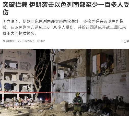 瞒不住了!以色列遭到重大损失,内塔尼亚胡亲自承认,以色列度过了一个艰难的夜晚!3月22日,根据法新社报道,在美以轰炸伊朗核设施之后,伊朗随即击中火力于晚间对以色列南部实施了两轮轰炸。法媒表示,多枚导弹突破以色列拦截,在以色列南方造成至少100多人的伤亡,并给该国造成开战三周以来最重大的物质损失。 这场冲突的导火索早在2月28日就已点燃,美以以日内瓦谈判破裂为借口,发动了代号“史诗怒火”和“狮吼行动”的联合空袭,不仅斩首了伊朗最高领袖哈梅内伊等数十名核心高官,还袭击了伊朗多座核设施和导弹工厂,甚至波及米纳卜市一所小学,造成148名平民死亡。这种旨在摧毁伊朗抵抗能力的“闪电战”,最终没能如预期般快速结束,反而让伊朗的反击越打越烈。 3月21日美以对伊朗纳坦兹核设施的轰炸,成了压垮局势的最后一根稻草。伊朗的回应没有丝毫拖延,当天晚上就启动代号“真实承诺-4”的报复行动,将火力精准对准以色列南部的迪莫纳和阿拉德两市——这两个地点紧邻以色列内盖夫核研究中心,摆明了是“你炸我的核设施,我就瞄准你的核禁区”的对等反击。两轮轰炸中,多枚弹道导弹突破以色列防空网,造成至少100多人伤亡,其中迪莫纳39人受伤,阿拉德64至88人受伤,迪莫纳一栋三层住宅楼完全倒塌,阿拉德至少10栋公寓楼受损,这也是开战以来以色列遭遇的最严重物质损失。 让人意外的不是伊朗反击的烈度,而是以色列防空系统的失效。以军一直引以为傲的多层次防御网,这次没能拦住看似“熟悉”的老型号导弹。核心原因在于伊朗采用了饱和打击战术,截至3月20日,伊朗革命卫队已发起64轮反击,累计发射弹道导弹和火箭弹超过2000枚,各型无人机超2700架,平均每天3轮高强度打击的节奏,让以色列的拦截系统根本顾此失彼。更关键的是双方武器成本的悬殊,伊朗“沙赫德-136”无人机单架成本仅2万美元,近程弹道导弹约50万美元,而以色列“铁穹”拦截弹单枚4万至8万美元,“箭-3”反导弹更是超过300万美元,长期拦截下来,以色列的经济压力远大于伊朗。 这场报复行动早已埋下伏笔,伊朗的反击逻辑清晰且层层递进。64轮打击中,70%的弹道导弹和80%的中远程打击都来自伊朗本土直接发射,而非外界猜测的依赖地区代理人。打击目标也经过精密规划,65%的火力对准以色列空军基地、反导阵地和美军中东核心军事基地,25%用于牵制沙特、约旦等地的美军前沿基地,仅10%用于威慑配合美以的海湾国家设施,全程围绕“削弱美以作战能力”展开,绝非盲目轰炸。即便在首轮空袭中遭受重创,伊朗依然保有一次性发射72枚弹道导弹的能力,3月10日就曾用这种方式报复过美以对库姆的空袭。 局势的复杂之处在于,军事对抗的背后还夹杂着激烈的外交博弈。就在伊朗轰炸以色列的同时,特朗普在社交媒体向伊朗发出48小时通牒,要求无威胁开放霍尔木兹海峡,否则将摧毁伊朗发电厂,而伊朗武装部队发言人直接回怼,称若能源设施遭袭,将打击中东所有美以相关的能源、信息技术和淡水设施,双方的威胁已经从军事目标延伸到民用基础设施。但矛盾的是,特朗普团队私下已在通过埃及、卡塔尔等第三方与伊朗接触和谈,美方要求伊朗5年内停止导弹和铀浓缩活动,关闭三处核设施,而伊朗则坚持要确保不再遭袭击并获得赔偿,目前双方核心诉求完全对立,和谈进展缓慢。 国际社会的调解在当下显得格外无力。国际原子能机构紧急发声,确认双方核设施未发生泄漏,呼吁保持军事克制,但枪炮声中的劝和缺乏实际约束力。已有多个国家尝试推动停火,但伊朗明确拒绝临时停火,只接受能一劳永逸结束战争的方案,而内塔尼亚胡在承认损失的同时,仍强调“决心继续在各条战线上打击敌人”,甚至此前曾放出“需要地面部队推翻伊朗政权”的狠话,这意味着冲突升级的风险并未降低。 三周的战火已经造成了难以挽回的人道灾难。伊朗方面公布的数据显示,已有超过200名未成年人和200名女性遇难,受伤人数不计其数,民用设施受损超过6.1万个;以色列南部城市也沦为废墟,救援人员在瓦砾中搜救的画面,让这场冲突的残酷性暴露无遗。更值得警惕的是,双方的对抗正在打破地区平衡,伊拉克境内亲伊朗力量、黎巴嫩真主党已开始牵制美以兵力,霍尔木兹海峡的航运安全也面临威胁,一旦局势失控,不仅会让更多平民卷入战火,还可能引发更广泛的地区动荡。 目前来看,这场冲突陷入了“打击-报复-再打击”的死循环。美以想通过军事压力迫使伊朗屈服,却低估了伊朗的抵抗意志和战争储备;伊朗的强硬反击虽然打疼了以色列,却也让自身面临更大的安全风险。特朗普政府一边放狠话施压,一边悄悄寻求和谈,内塔尼亚胡既要稳住国内舆论,又要应对伊朗持续的反击,双方都陷入了进退两难的境地。这场“艰难的夜晚”或许只是一个开始,如何打破僵局、避免局势进一步恶化,已经成为摆在所有相关方面前的紧迫问题。