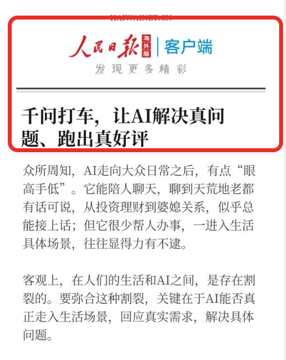 西方科技公司,估计要气坏了!中国公司再次反超,干成了他们想干却没干成的事儿。 在AI领域竞争是非常激烈的,尤其是AI应用层面。 在AI购物方面,亚马逊、谷歌等公司布局很久了,但一直没有落地。反观千问,在春节的活动中取得了巨大的成功,有超过1.3亿人通过千问下单。 让西方科技公司没想到的是,春节过去还没多久,千问又将AI办事能力推进了一步,推出了AI打车,一句话就能打到自己想要的车。 这个AI打车相比于之前的办事,难度更高,需要理解复杂的生活场景。 比如你告诉千问“要去银泰购物,途径某小区接上朋友,打的车要干净卫生,空气清新”,这个出行需求,看似是一件事,实际上是三个需求。而千问能精准办到这也就意味着,千问将AI技术已经从互联网虚拟世界接入到了实际生活。 这么一来的话,技术发展的红利,就能惠及到每一个人的普通生活中。 针对AI打车,西方科技公司也非常想推动落地,在全球范围内,Gemini、OpenAI都尝试过接入AI打车,但目前只能唤起APP,根本做不到像千问这种一句话全部搞定。 对于千问表现出的这种应用能力,国内的顶尖媒体,也给出了非常高的评价,人民日报说千问回应的是大众的真实需求,解决的是真问题!足以可见千问的技术实力有多强了。