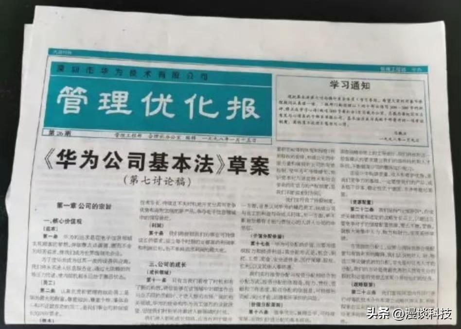 二十八年的今天,在深圳南山明华中心,《华为公司基本法》通过审定。 《华为基本法》是华为公司于1998年3月正式审议通过的企业管理大纲,被称为中国首部企业宪章,全文共六章、一百零三条,系统性阐述了华为的核心价值观、战略方向与基本政策,为华为从高速成长到全球化发展奠定了制度根基。据悉,起草团队由任正非主导,中国人民大学六位教授(“人大六君子”)组成核心起草组。