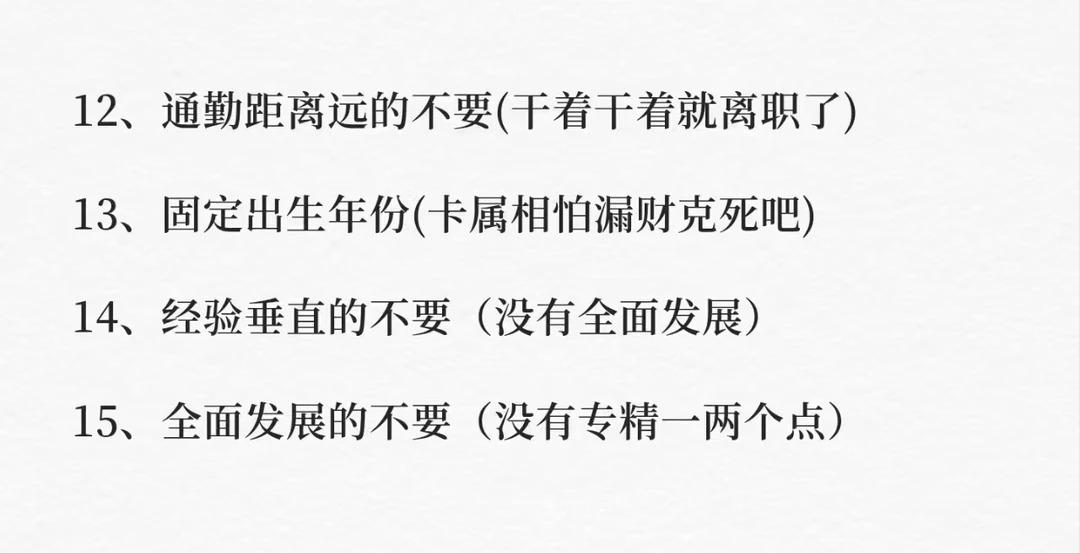 38+中年女士找工作两周,备受打击,浅浅总结一下现在的招聘要求! 未婚不行,已婚未育不行,一胎不行,二胎不行,三胎不行,不婚不育更不行 脾气好不行,有个性不行,能拿捏不行,拿捏不住更不行 跳得多不行,空窗久不行,经验少不行,太厉害又怕你贵 最后完美岗位的要求应该是这样的: 28 岁,10 年工作经验,已婚已育俩娃,孩子都上初中,性格温顺又有棱角,抗压拉满还不请假,工资只要 3000。 满足条件的只有一种生物: 设定好程序、不要工资、不用充电、不用吃饭、不用回家、不用结婚生娃、还自带十年工龄的 AI 机器人。 真的,现在找工作不是看能力,是在卡人生剧本,38岁的中年少妇还能找到工作吗?[流泪]