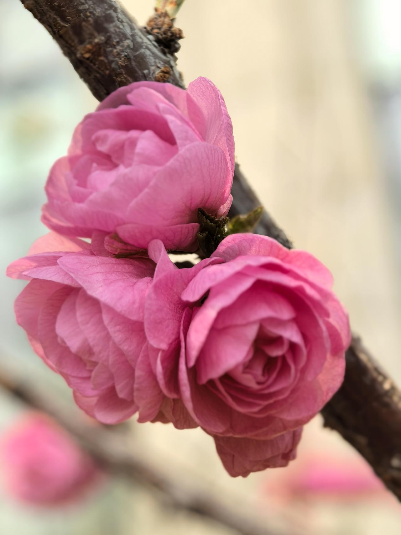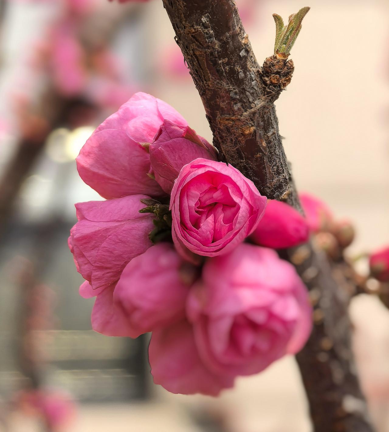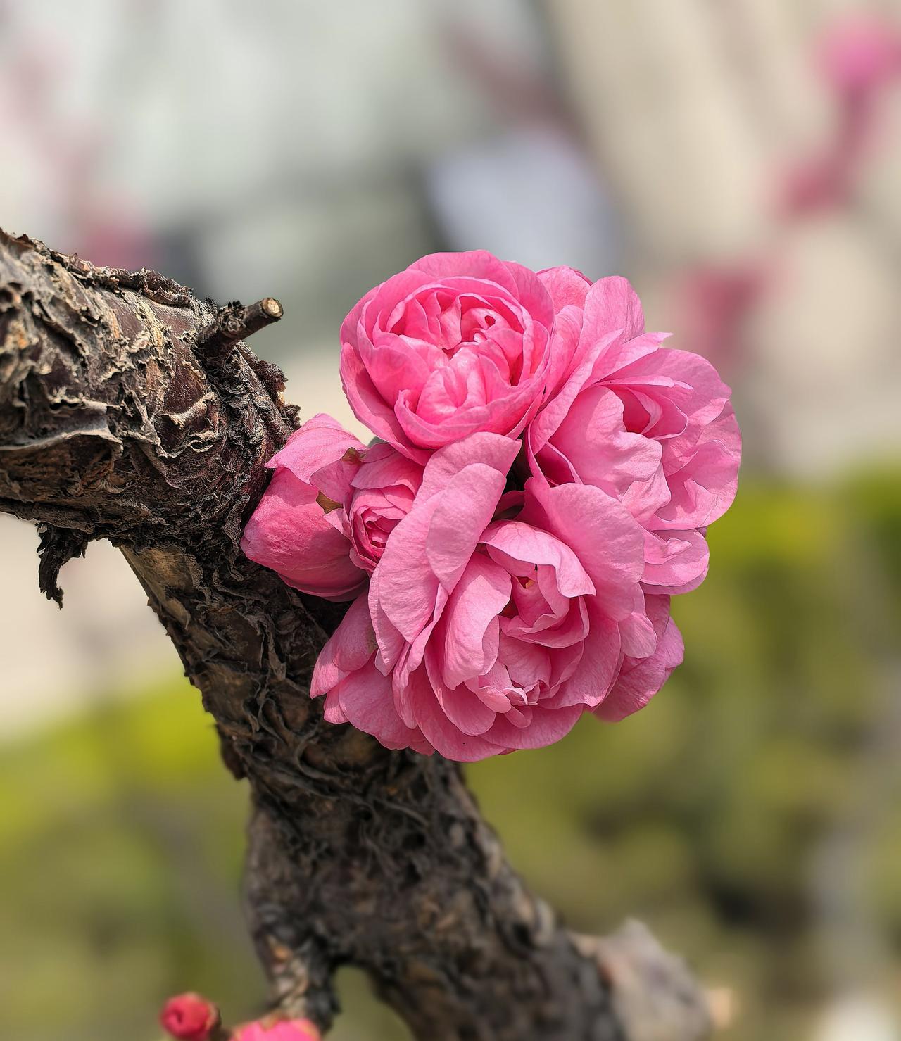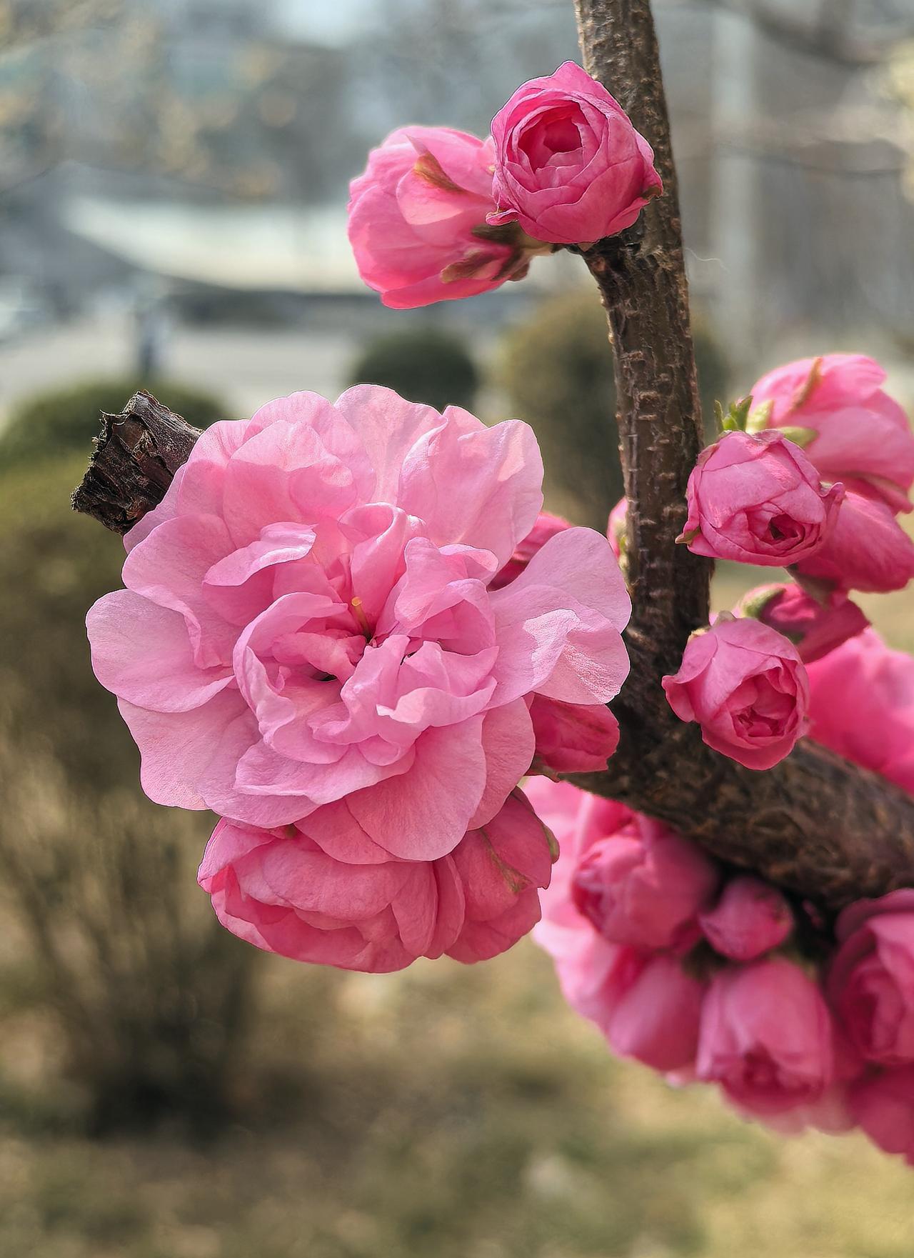 出门遛弯,竟在农科院院子里邂逅了一棵开花的梅花树,简直太惊喜!那玫瑰红色的花苞,像一个个小巧玲珑的灯笼,透着股俏皮劲儿。粉色的重瓣花朵层层叠叠,宛如少女羞涩的裙摆,在微风中轻轻摇曳。 梅花向来是坚韧的象征,在这乍暖还寒时独自绽放,美得毫不张扬。我站在树下,贪婪地嗅着那淡雅的花香,感觉所有烦恼都被这股清香驱散了。生活中就是需要这样的小确幸,不经意间就能治愈人心。