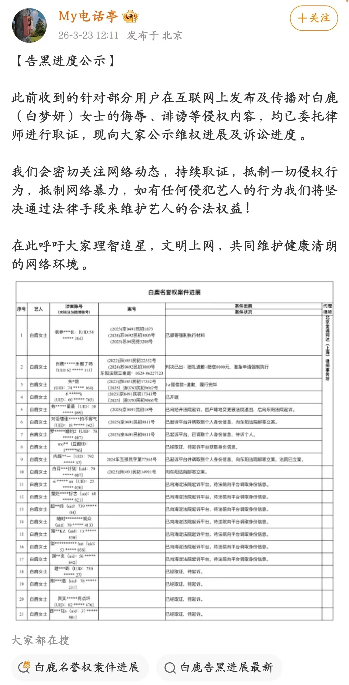 看到白鹿维权进展了,取证不止、告黑不停,这个讯号传递出来了,对于那些恶意抹黑造谣的人,必须要让它们疼,才知道网络并非法外之地,支持白鹿进一步维权!