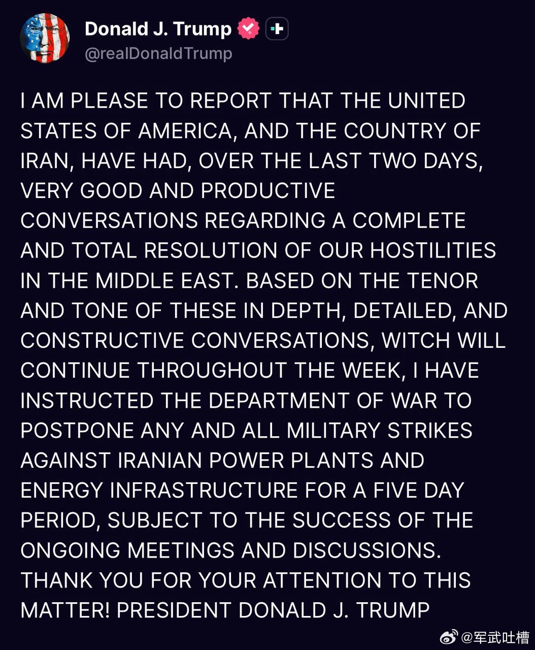 兄弟们,只有明天的懂王能打败今天的懂王!战争刚开始时,懂王说伊朗只有无条件投降,没有谈判今天,懂王说和伊朗谈过了,暂停空袭5天还好伊朗现在也没那么蠢了,表示懂王这招只是缓兵之计伊朗称特朗普推迟袭击表态为心理战中方强烈呼吁立即停止军事行动美伊以冲突