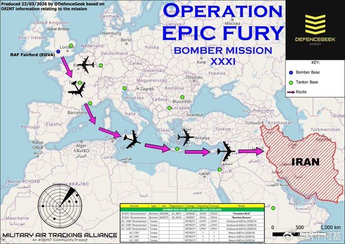 3月21 日,美国空军2架B-1B战略轰炸机和2架B-52H战略轰炸机从英国起飞执行对伊朗的轰炸任务,这两组轰炸机伴随的各有6架空中加油机进行保障,这已经是美国空军对伊朗进行的第30和31次轰炸。