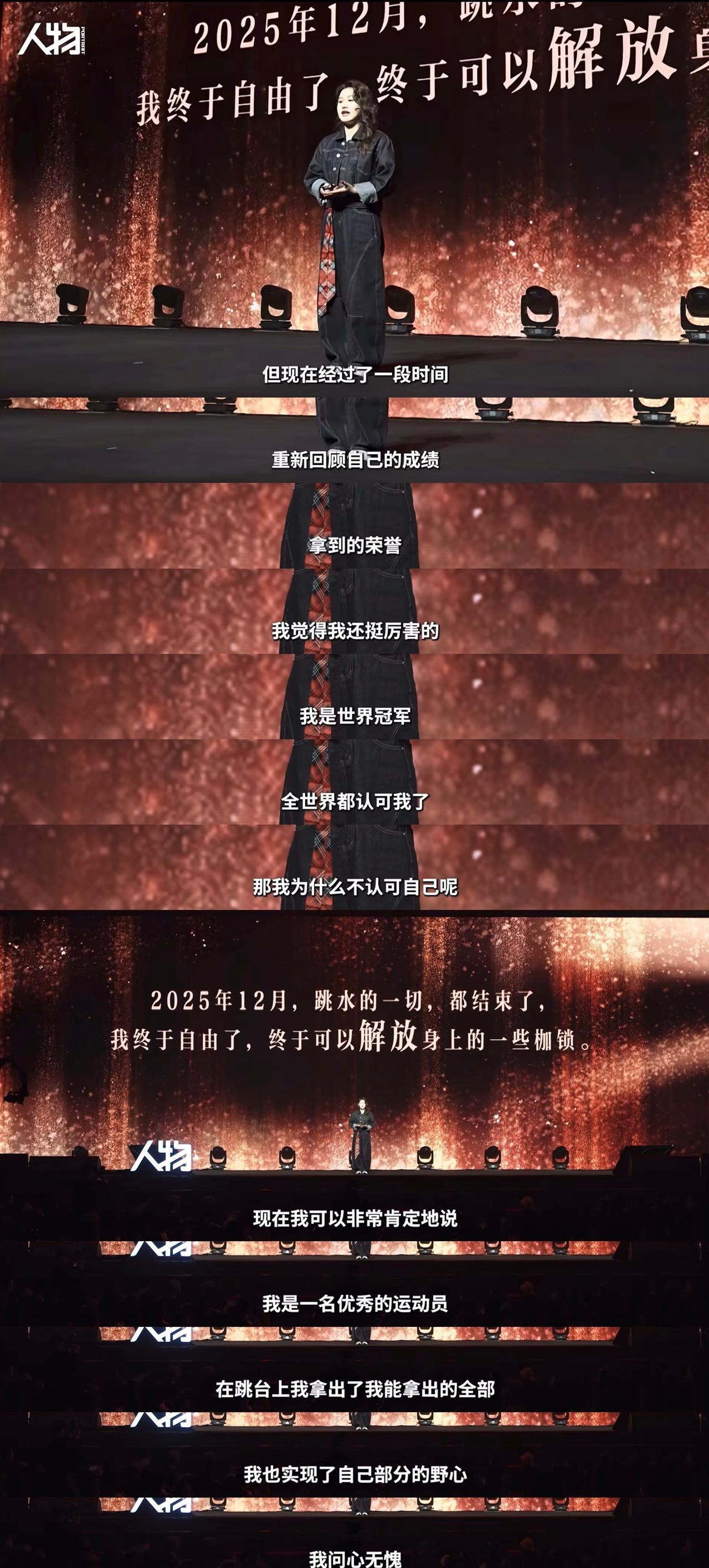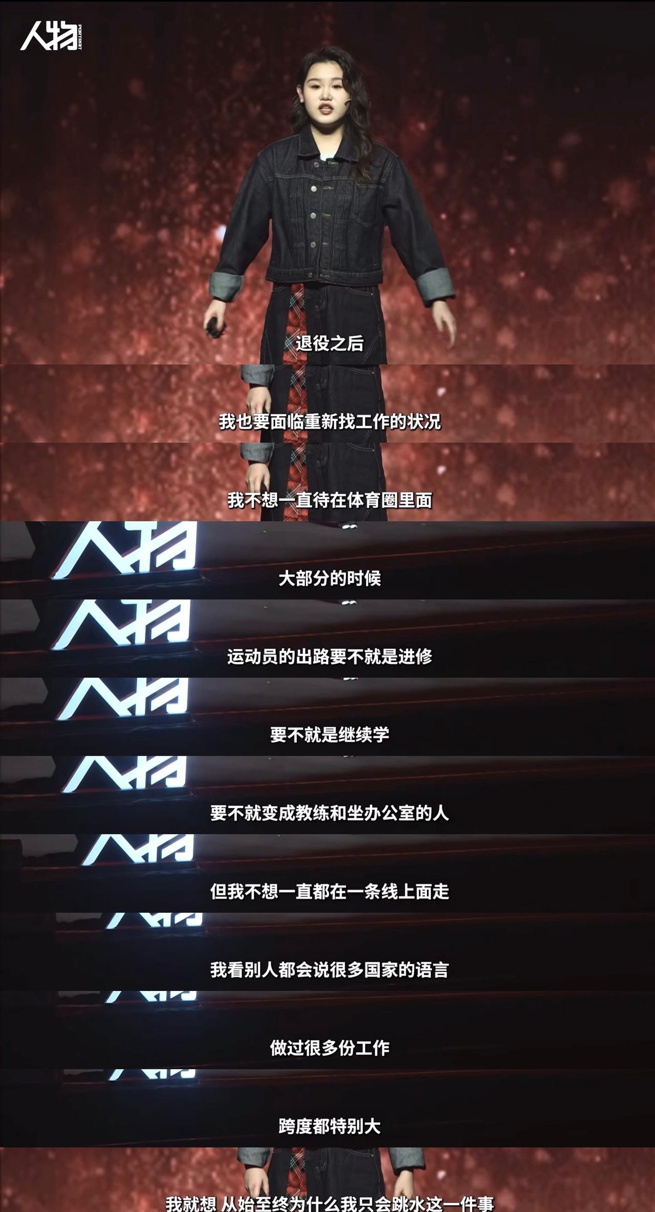 《人物》今年的女性力量讲座主题是「野心时代」,张家齐也去了!听完她的演讲又感动得眼泪汪汪,永远喜欢像春芽一样破土生长的女孩子们。 对14岁就拿到奥运金牌的女运动员来说,张家齐曾经的野心是「赢」,和出鞘的刀锋一样锋利而直白。那一年,她以为自己会一直赢下去。 但这样理所当然般的自信,在发育期面前变得不再稳固。发育期会让男性长肌肉、力气变大,从而完成更高难度的动作,对女性来说,却是让身体变重、动作失控,原本熟悉的空翻变得陌生,她需要用更大的力气去完成同样的动作,只能用节食对抗身体的自然生长。 女子十米台更新换代极快,她知道自己没有时间慢慢适应,只能一边恐惧一边硬跳,在心里发狠诘问自己,它整得死我吗,整不死就跳吧。 张家齐描述那几年时,说自己经常一天只吃一顿饭。身体本应是生长期女孩们最大的底气,对于女子跳台来说,却像仇人一样让她们惶恐又厌憎,她无法去埋怨教练和父母,也不愿去嫉妒与她并肩作战的队友们,所有黑色的刀刃最后也只好刺向自己。 所以看到张家齐退役、走下跳台,开始继续尝试不同的人生时,我真心替她高兴。 对于一个从小守规矩的优等生,活在严格限制的体系里的女孩来说,想要在广阔的世界里扎根,是一件需要自己不破不立的事情。别人定下的规矩和目标既是枷锁也是轨道,但现在轨道拆了,她只能替自己支起靶心。 张家齐用了很长一段时间,重新建立对自己的认同。 在一个长期被挑错的环境里长大,很难自然地完成自我肯定。张家齐也是在退役之后才意识到,我都是世界冠军了,全世界都认可我了,我为什么不认可我自己? 退役之后的「普通人」生活也并不简单,在队里时一切都有人替她一手操办,但作为普通人,她需要重新学习如何办证件、如何选课、如何订票,这些繁琐渺小的日常,对她来说是全新的冒险。 于是她开始一点点积累经验,从生活细节入手,一件一件解决,在这些小事里重新获得控制感。她还在尝试新的职业路径,做综艺、做直播,恐惧并没有和跳台一起离开她,她仍然会紧张,为很多事感到担心。 但她会想,反正再难也没有跳水难。那些她经历过的极限训练,让她对「困难」的尺度有了不同的定义。有人说她现在恰饭了,说她天才陨落了,但那也是她用自己的劳动赚钱,没有什么不好意思的。她想要经济自由,这是最大的底气。 张家齐说这些话的时候,眼里的野心仍然像14岁一样熠熠生辉。 野心并不只是优绩主义,它不必依附于某一个赛场,也不需要符合外界的某个评价体系,才被允许存在。野心也可以只是让自己在旷野中站稳脚跟,在这里插下一个路标,告诉自己,我值得站在这里。 我当然喜欢看竞技体育里的女性们又争又抢、蓬勃而旺盛,但我更希望看到她们不只是昙花一现,能拥有漫长而明亮的四季。她们不需要把人生压缩在某一个巅峰时刻,而是被允许重新学习如何生活、如何选择未来。她们可以拥有丰富的野心,更安静而更柔韧,让根系向四面八方展开。 女孩们,只管像水一样流动吧,命运一定会把你们托举到更好的地方。