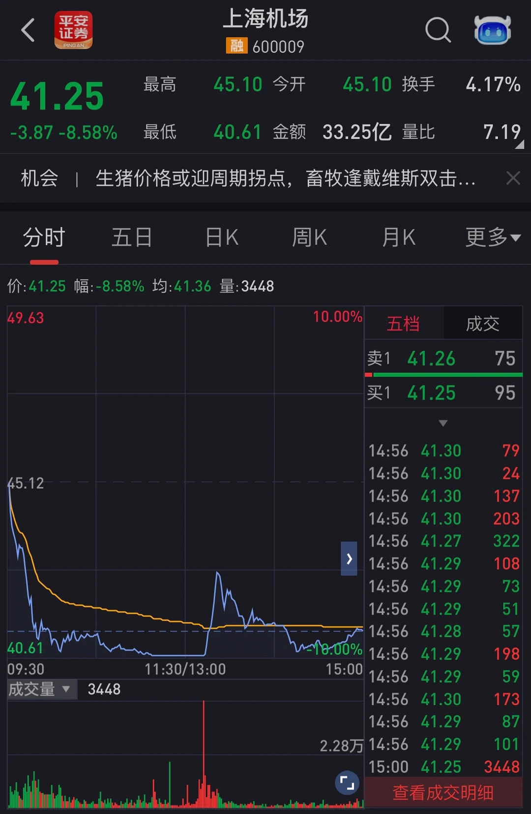 上海机场跌幅8.58%,股价41.25元,已创下24个月内新低。