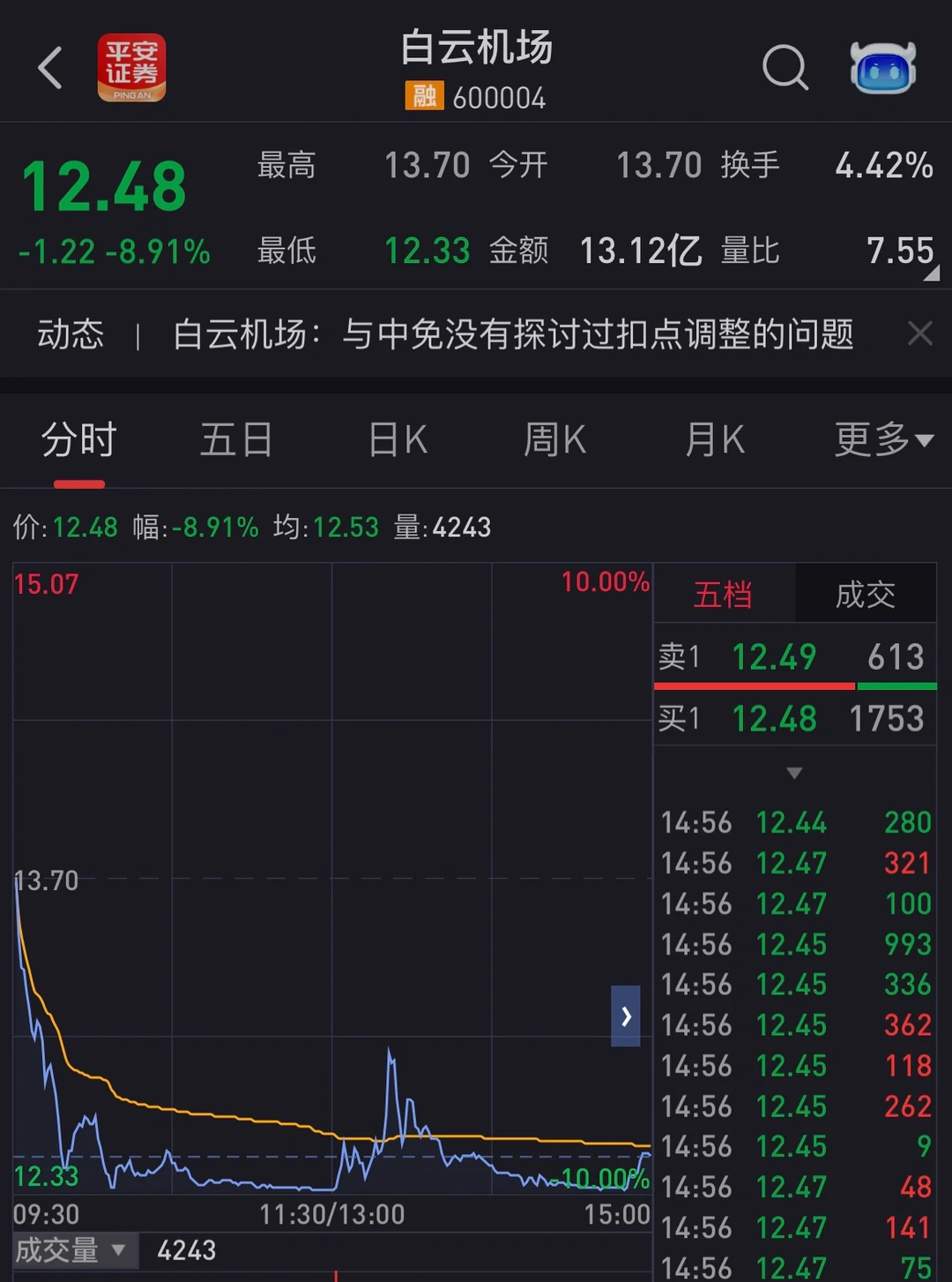 白云机场大跌8.91%,股价12.48元,已创下12个月以来新低。