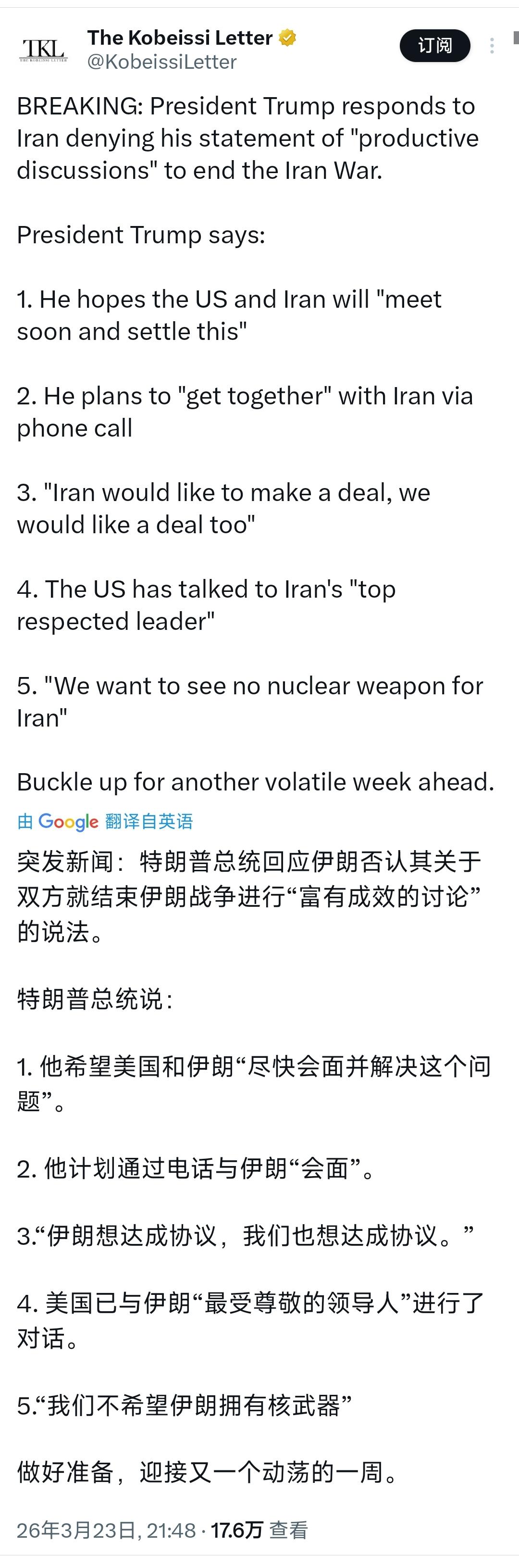 突发新闻:特朗普今晚(北京时间3月23日晚)回应伊朗否认其关于双方就结束战争进行“富有成效的讨论”的说法。 特朗普表示: 1. 他希望美国和伊朗“尽快会面并解决这个问题”。 2. 他计划通过电话与伊朗进行“联系”。 3. “伊朗想达成协议,我们也想达成协议。” 4. 美国已与伊朗“最受尊敬的领导人”进行了对话。 5. “我们不希望伊朗拥有核武器”。 [机智]评几句:真真假假,假假真真,特朗普还剩多少可信度。特朗普来到中国,可能他的信用值都不够免押金租用充电宝。被伊朗光速打脸后仍嘴硬狡辩,一边坚称与伊方“最受尊敬的领导人”有对话,一边又改口要电话联系、尽快会面,前言不搭后语的表态尽显心虚。此前放话打击伊朗发电站,如今又假意求和说双方都想达成协议,翻手为云覆手为雨的操作,不过是其政治投机的老套路。把中东战事当儿戏,用虚假言论搅动资本市场,再用苍白说辞试图自圆其说,特朗普的每一次表态都在透支美国的国际信誉,这般毫无底线的政治表演,不过是让世界看清其为了政治私利不择手段的真面目。