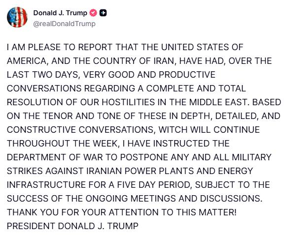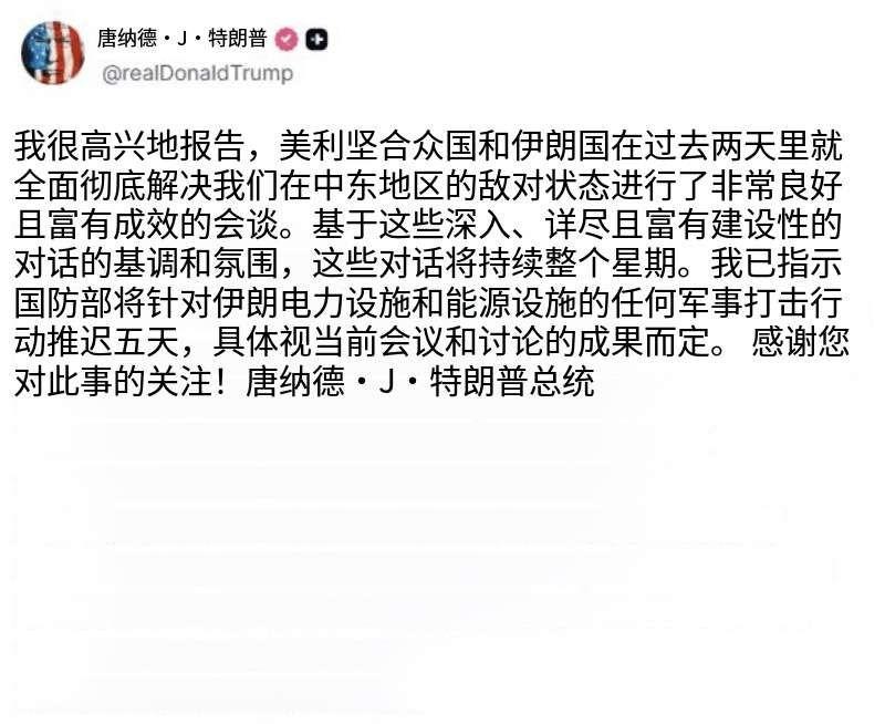 突发消息:特朗普宣布暂时停止对伊朗发电厂发动袭击的任何计划。 特朗普今晚(北京时间3月23日晚)写道:“我很高兴地报告,美利坚合众国和伊朗在过去两天里就全面彻底解决我们在中东地区的敌对状态进行了非常良好且富有成效的会谈。基于这些深入,详尽且富有建设性的对话的基调和氛围,这些对话将持续整个星期。我已指示国防部将针对伊朗电力设施和能源设施的任何军事打击行动推迟五天,具体视当前会议和讨论的成果而定。” [机智]评几句:离最后通牒不到12小时,特朗普又双叒叕变了。前脚刚撂下48小时不开放霍尔木兹海峡就炸平伊朗发电厂的狠话,后脚就转头宣称与伊朗展开了“富有成效”的会谈,还美滋滋地将军事打击推迟五天,变脸速度比战场局势翻转还快。这场自导自演的极限施压,不过是霸权者色厉内荏的拙劣表演:一边喊着要动武,一边扛不住伊朗持续反制的底气、战争高企的经济成本,还有国内反对声浪的压力,所谓的最后通牒不过是给自己留退路的幌子。嘴上说着“全面解决敌对状态”,实则现在连谈判前提都未厘清。这般反复无常的操作,哪里是运筹帷幄的总统,不过是见风使舵的投机者,把国际博弈当成了随心所欲的儿戏。
