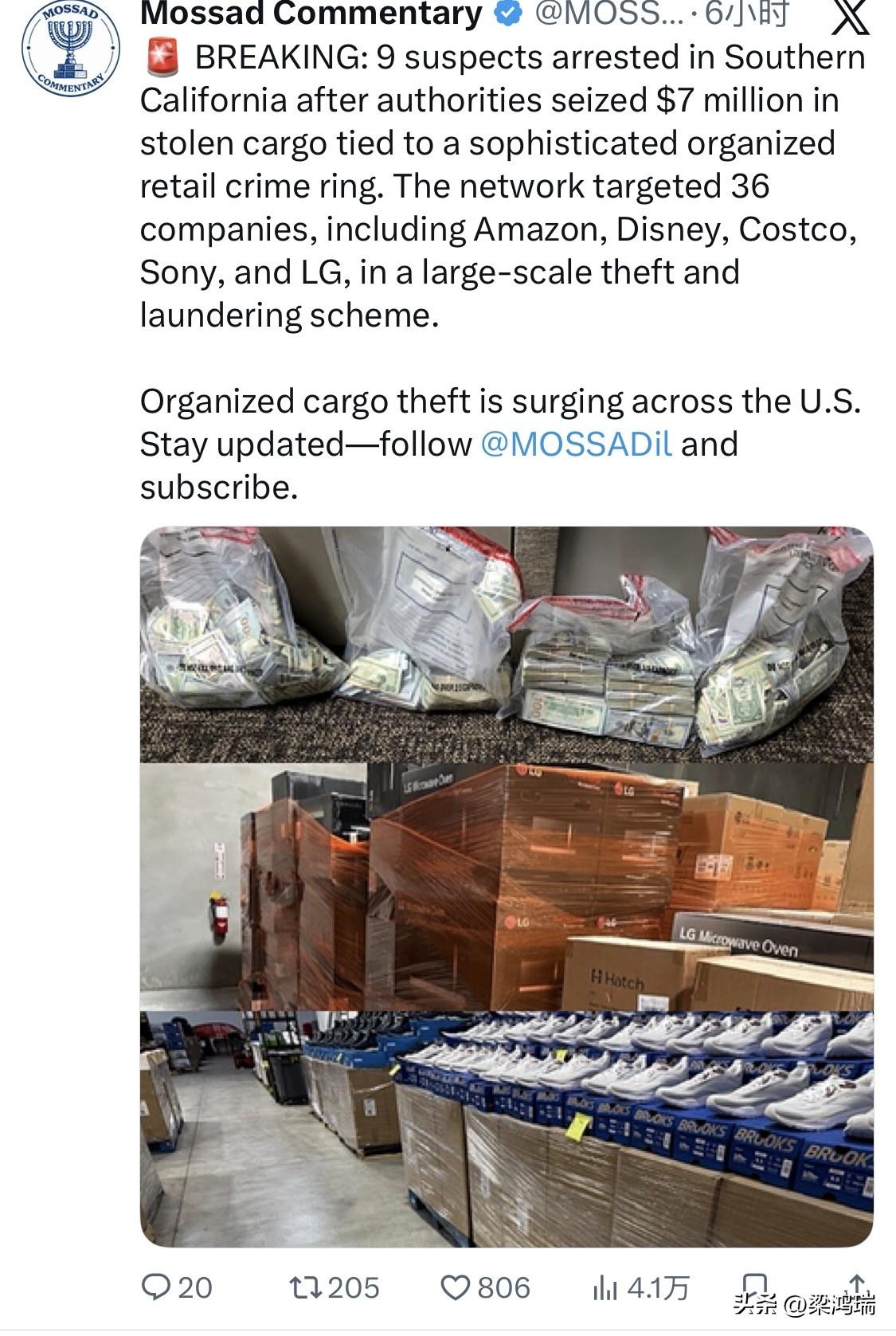 洛杉矶县警局表示,警官们还追回了100万美元现金,并逮捕了9名嫌疑人,罪名包括盗窃货物、洗钱和接收赃物。