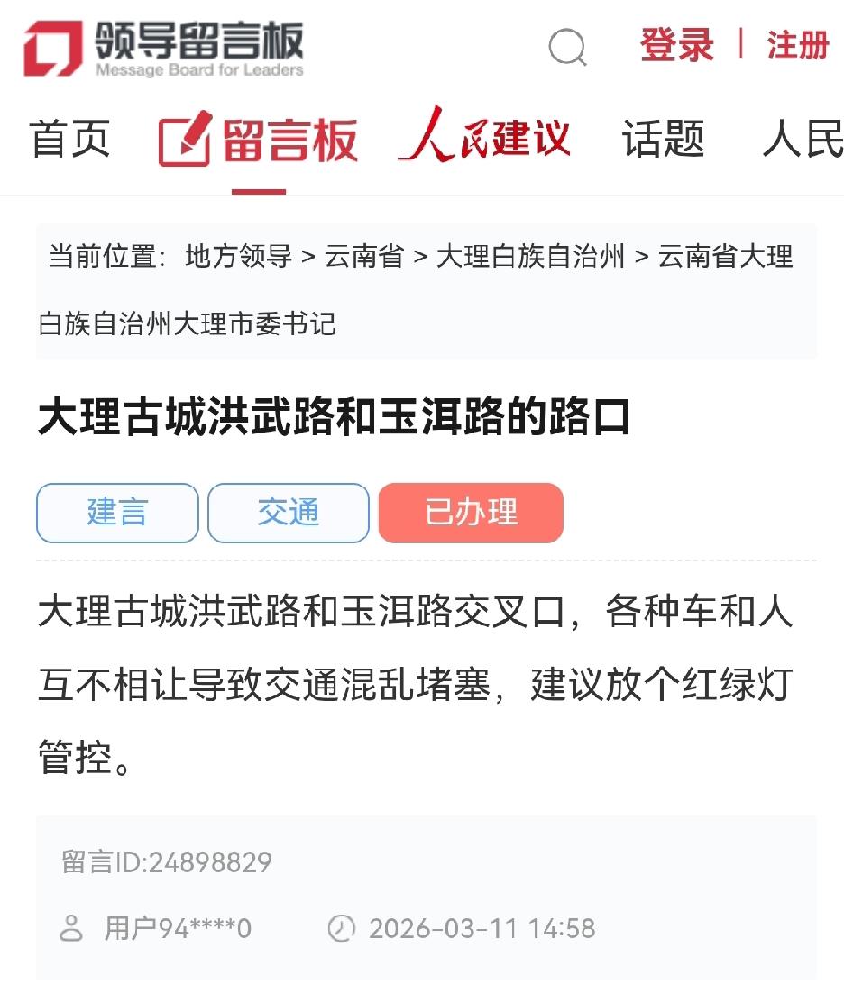 网民留言反映大理古城洪武路和玉洱路的路口交通混乱拥堵建议加强监管 ✍📩📨3月11日,网民通过人民网领导留言板向大理市委书记留言: ➡️大理古城洪武路与玉洱路的路口 此处各种车辆和行人互不相让,导致交通混乱、堵塞,建议设置红绿灯进行管控。 2026 - 03 - 23 19:01 大理市公安局交通警察大队官方回复 网民同志:您好! 大理古城是中国历史文化名城,也是大理旅游核心区。每逢节假日旅游高峰,大理古城的车流、人流剧增,大量自驾游车辆涌入,使得古城区各条主要道路人满为患,给道路交通管理带来极大压力。特别是停车难问题日益突出,车辆随意乱停乱放现象随处可见,导致道路交通拥堵频发,给外来游客及周边群众的安全出行带来不便,还存在安全隐患。 造成交通混乱的主要原因如下: 一是大理古城道路狭窄。古城区的玉洱路、一塔路、洪武路、叶榆路、中和路、博爱路等路段及各平交交叉路口人车混行冲突严重,道路交通通行缓慢,出行高峰时段可能出现交通拥堵。 二是路网结构不合理。受历史因素影响,重大节假日期间大量外来车辆和游客涌入,周边路网无法满足承载需求,交通乱象极为突出。 三是停车资源匮乏。停车资源严重不足,车辆乱停乱放现象普遍,极易造成交通拥堵和通行缓慢。 四是交通参与者交通素质参差不齐,随意停车、横冲直撞现象突出。 五是电动自行车管理难度大,存在较大道路交通安全隐患。辖区发生的交通事故中,电动自行车占比近一半。而且源头管理混乱,特别是租赁市场管理混乱,电动自行车乱停乱放现象普遍,管理难度大,存在安全隐患。 大理镇人民政府于2023年7月至2025年3月在大理古城洪武路与玉洱路口安装了临时交通信号灯。经过一年半的试运行发现,交通拥堵情况更加严重,且未能从根本上缓解交通冲突。 针对您建议安装信号灯的诉求,结合大理古城风貌和古城区道路狭窄的实际情况,暂不宜安装红绿灯。在今后的勤务管理工作中,中队将进一步分析研判,加强警力现场指挥管理,提升道路交通通行能力。感谢您的支持和理解。 大理避堵攻略 大理乱停车 大理古城