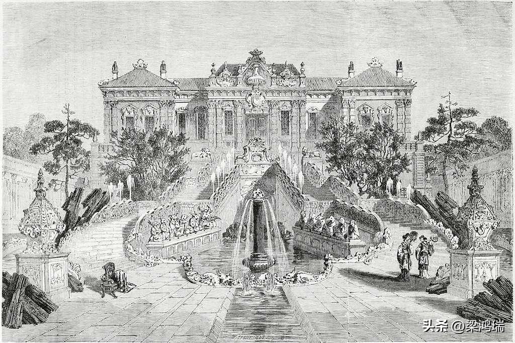 这幅版画出自 18 世纪乾隆时期由意大利传教士郎世宁(Giuseppe Castiglione)等人设计的《圆明园西洋楼二十景图》铜版画集。也曾出现在 19 世纪欧洲的旅行刊物(如《环球旅行》Le Tour du Monde)中,向西方介绍清代的皇家园林。