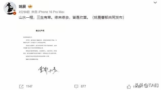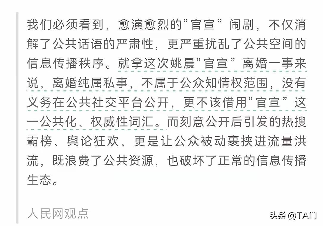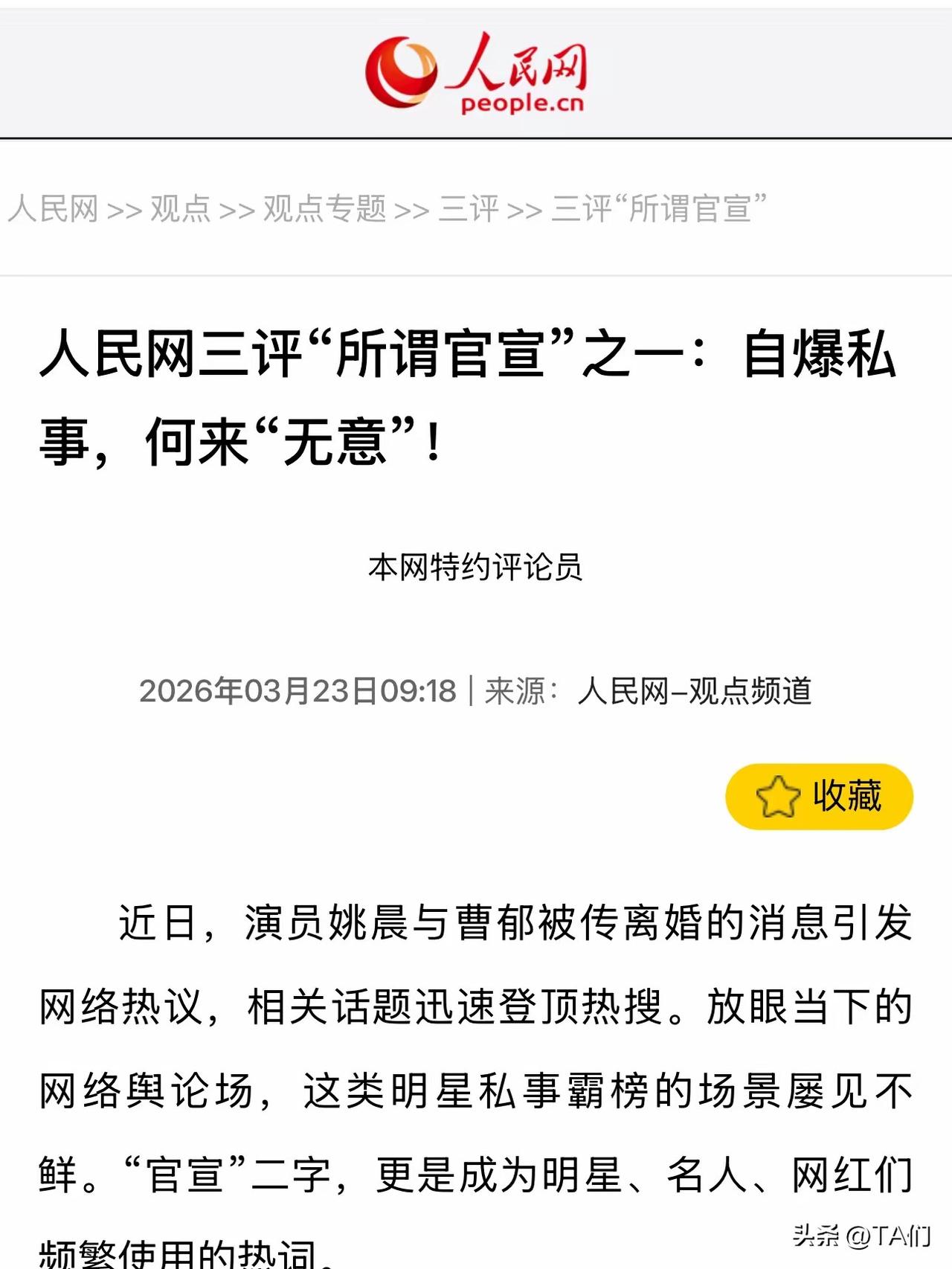 离婚官宣冲上热搜,人民网罕见发声,背后原因不简单 姚晨与曹郁联合官宣离婚,称多年前已分开,为孩子选择隐离,文案体面却瞬间引爆全网,热搜霸榜刷屏。 本是明星私事,为何会引来人民网直接点名批评?官媒发声直指核心,并非反对离婚,而是戳破了内娱长期存在的流量乱象。 人民网明确表态:离婚纯属私事,不属于公众知情权,明星没有义务公开,更不该滥用“官宣”这一权威词汇博关注、占用公共资源。 不少网友表示,明明可以低调处理,非要高调发布声明,看似为孩子,实则制造舆论狂欢。当婚恋私事反复霸占热搜,真正有价值的公共信息被挤压,这种流量狂欢确实该降温了。 也有网友认为,明星有公开私生活的自由,但不该消耗公共资源,体面背后更要守住边界。 此次官媒点名,不只是针对姚晨一人,更是对整个娱乐圈滥用官宣、消费公众注意力的警示。 大家觉得,明星离婚有必要高调官宣吗? 姚晨 官宣 人民网