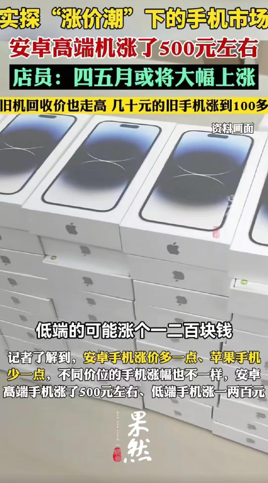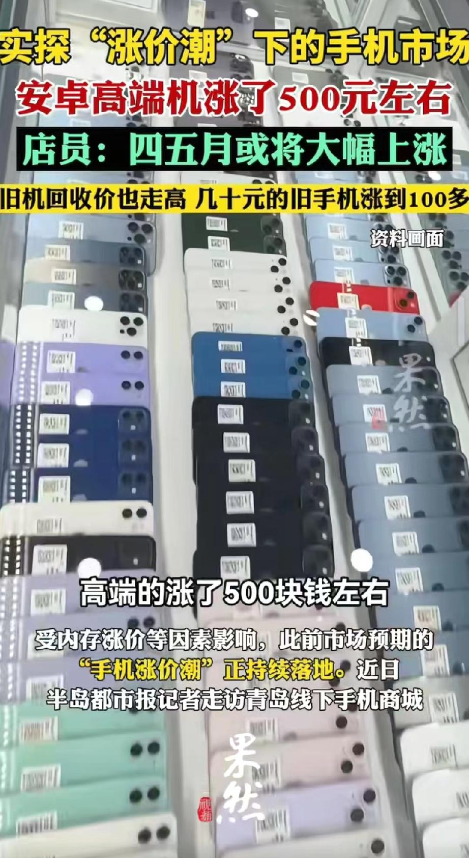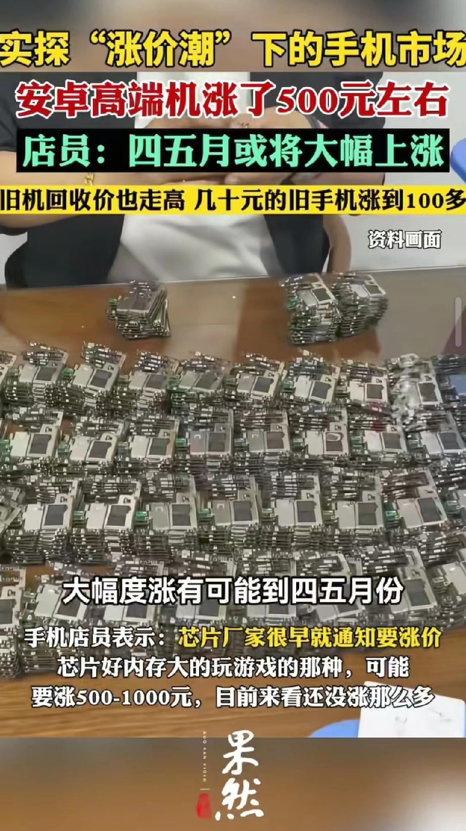 刚刚刷新闻的时候刷到,现在手机可能会迎来涨价潮。 而且有部分店员说,4月份,5月份或将迎来大幅度上涨。 低端的可能涨个一二百块钱,高端的可能涨个500左右。 主要是因为存储条太贵了! 听到这个消息,一下子将我蠢蠢欲动换手机的心按耐住,自己手中的这个手机已经用了好几年了,是华为的mate系列,感觉现在还很流畅,只是内存有点不足了。 不知道从什么时候开始,现在手机内存越来越不够用,各种app占的内存越来越多,清理都清理不完,内存告急,真的令人很头疼! 忍一忍吧! 暂时先不换手机了,毕竟现在这个手机还能用,未来等手机价格下降的时候再来买吧。 毕竟现在的经济大环境下,挣个钱也不容易。 大家大概几年换一次手机,欢迎在评论区留言。