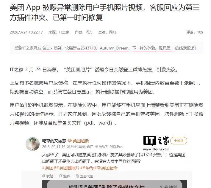 被曝删除用户手机照片,美团客服回应。 3月24日,话题“美团删照片”登上热搜引发网友热议。 据了解,事情的起因是有用户表示自己手机里的照片、视频曾被美团删除。且有人表示自己在未执行任何操作的前提下,手机相册里的照片、视频突然被清空,且系统拦截日志显示执行删除操作的APP是美团。 针对此事,美团客服账号在相关内容下评论称:“经排查,个别安卓系统版本下,第三方插件冲突导致缓存清理时会出现异常提示,不涉及对您个人信息的读取、存储或泄漏。我们已第一时间修复。如清理文件确实涉及您的个人文件,可前往手机回收站或最近删除找回。如需帮助,我们将为您提供一对一专项技术支持。”