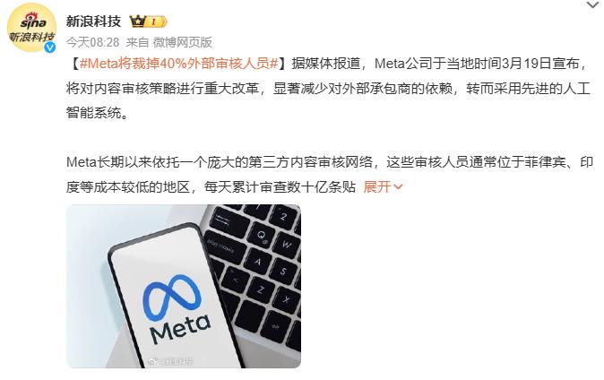 Meta将裁掉40%外部审核人员,AI会引发科技大厂裁员潮吗? 据了解,近日网传消息显示Meta将裁掉40%外部审核人员,转而使用AI去审核海量帖子,从中清理那些含有虚假信息、仇恨言论的违规内容。就时间轴而言,Meta或在未来的12个月内裁撤外部审核人员,并将相关资源逐渐倾斜给内部AI工具。