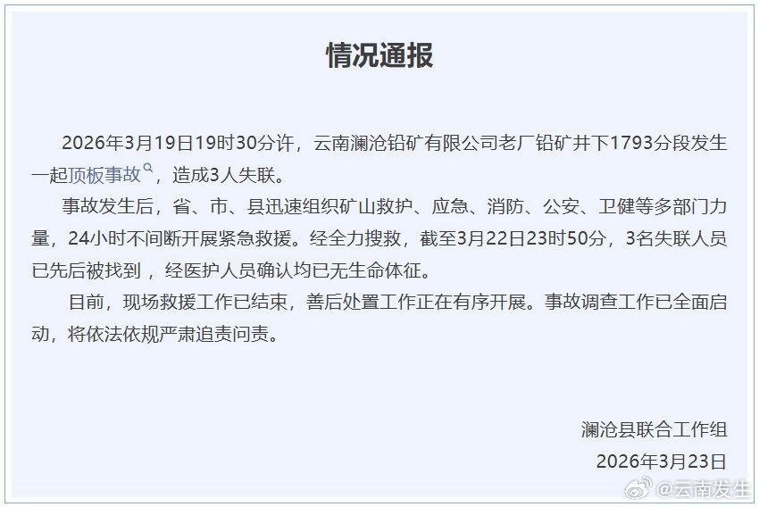 2026年3月19日19时30分,云南澜沧铅矿有限公司老厂铅矿井下1793分段的顶板事故,让3条鲜活的生命陷入危险。事故发生后,省、市、县多部门迅速行动,矿山救护、应急、消防等力量24小时不间断救援。 可惜的是,截至3月22日23时50分,3名失联人员虽被找到,却已无生命体征。这是一场令人痛心的悲剧,3个家庭就此破碎。目前救援结束,善后工作有序开展,事故调查也全面启动,希望能依法依规严肃追责,给逝者和家属一个交代,也给社会一个警示。