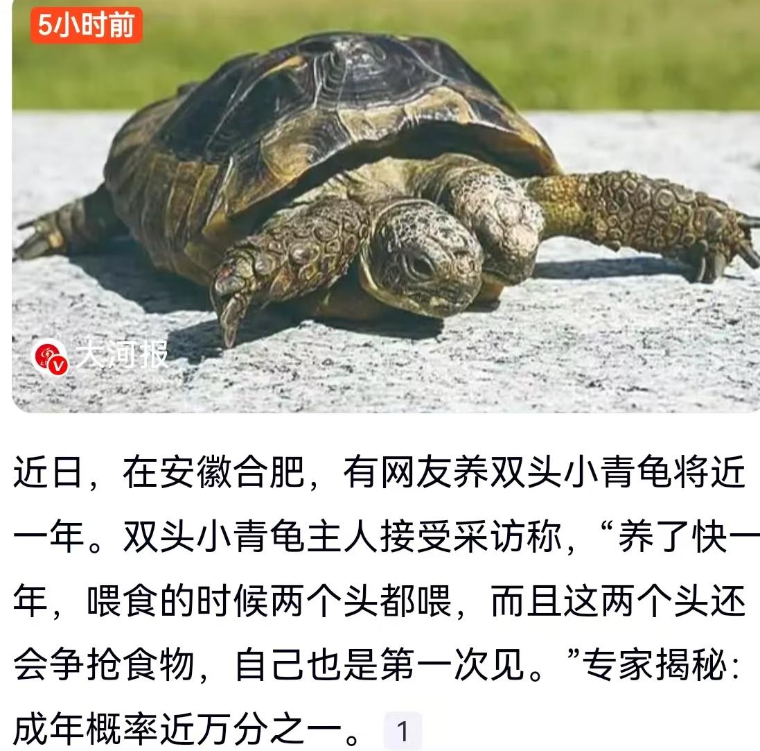近日,安徽合肥的一位龟友火了,原因是他养的一只小青龟成了全网围观的“稀罕物”。这只龟不一般,背上背着壳,脖子上却顶着两个脑袋。据主人介绍,这只双头小青龟已经养了快一年,平时喂食的时候最热闹,两个头还会为了抢食“大打出手”。这画面听着新鲜,实则充满了奇异的反差萌。 对于很多网友来说,双头龟是个只存在于传说中的概念。专家的揭秘更是给这只小龟蒙上了一层神秘面纱:这种双头现象属于基因突变,成年概率近万分之一。也就是说,这一万只龟里可能才有一只能侥幸长成这样,更多的可能在孵化过程中就夭折了。 其实,双头龟并不是神话里的“神兽”,而是一种无奈的“畸形”。根据爬行动物研究专家吉尔-马丁的分析,这本质上就是一对没有正常分开的“连体双胞胎”。本该是双黄卵孵化成两只独立的龟,却因为某种原因身体连在了一起。这就导致了一个尴尬的现实:一个身体,两套思维系统。就像合肥这位主人看到的,两个头会争抢食物,毕竟肚子只有一个,谁吃到了都算饱,但两个大脑却有着各自的食欲和判断。 这种“畸形”背后的成因,也给咱们敲响了警钟。科学家推测,双头动物频繁出现,可能与环境恶化有关。要么是孵化时受到了污染,要么是近亲繁殖导致的基因缺陷。大自然用这种方式在提醒我们,生态环境的微小变化,都可能引发生物种群的异常波动。 虽然看着新奇,但养过这种特殊宠物的人都知道,它们的生存之路异常艰难。两个大脑经常会产生分歧,比如一个头想往东,另一个头想往西,身体夹在中间寸步难行。再加上内部器官的复杂性,能像合肥这只小青龟一样存活近一年,已经是生命的奇迹。 对于普通爱好者来说,遇到这种生物,最好的方式是怀着一颗敬畏之心去看待,而不是盲目追求猎奇。毕竟,这种“万分之一”的幸运背后,往往伴随着生命个体的挣扎与脆弱。大自然的鬼斧神神工有时候会开个小差,但这只双头龟能顽强生存,本身就是对生命力量最好的诠释。 以上内容仅供参考和借鉴
