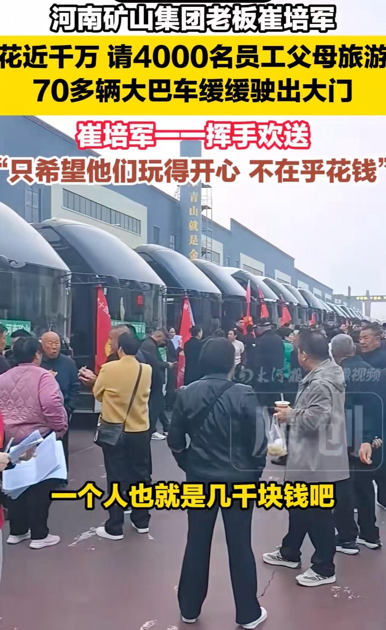 崔培军又让多少老板咬牙切齿?豪掷千万请4000名员工父母旅游,全网打工人羡慕:“我老板什么时候能这么大方?” 2026年3月24日,河南矿山集团启动了第十四届“孝文化感恩旅游节”。场面那是相当壮观! 78辆豪华大巴整齐排列,引擎轰鸣。车上坐的不是游客,而是4000多名员工的父母。 他们将开启为期6天的江南之旅,吃住行全包,全程不用掏一分钱。 网上有人酸了:“肯定是作秀!” 作秀?你作一个试试?还是连续作了14年那种! 如果是演戏,哪有老板愿意连着十几年,真金白银地往外扔几千万,只为了让员工的爹妈开心? 崔培军在送行现场挥着手,话说得特实在:“我就希望老人们玩得高兴,钱不是事儿!一个人也就几千块,花得值!” 其实在河南矿山集团,“发钱”简直就是家常便饭。 年会直接发现金8000万,妇女节红包发160万,中秋节还要宴请员工父母发礼金。 别的老板怕员工有钱了会跑,崔培军是怕员工钱不够花。 但是,很多人只看到崔培军的“豪横”,却不知道他这一路走来有多难。 他是个地道的苦孩子,出生贫寒,因为家里穷得叮当响,早早辍学去打工。 正是吃过苦、受过累,他才比谁都懂:只有让员工兜里有钱,心里不慌,人家才愿意死心塌地跟着你干。 【网友热议】 “崔总,您公司还缺扫地的吗?或者缺看大门的?我不嫌累,就想体验一下被‘宠上天’的感觉!” “这才是真正的良性循环啊!全中国都知道崔培军是个好老板,谁不愿意跟这样的人做生意?生意越好,赚得越多,给员工分得越多,这雪球越滚越大,那些抠门老板怎么比?” “在这种公司上班,谁敢辞职?要是辞了,回家不得被爸妈打断腿?‘这么好的老板你去哪找?’” “矿山集团简直是网红企业,一年刷到两次:年初包车送父母旅游,年底卡车拉现金发奖金。看得我眼泪从嘴角流了下来。” “看看人家老板,再看看我家那位:见我累成狗他高兴,见我笑一下他就难受,生怕我多拿一分工资。真是人比人气死人!” 【评语】 很多老板整天研究什么“狼性文化”、什么“末位淘汰”、什么“画饼充饥”,恨不得把员工身上的每一滴油水都榨干。 他们以为这叫管理,其实这叫自掘坟墓。 崔培军看似“人傻钱多”,实则活得太通透了。 他明白一个最朴素的道理:机器坏了可以修,人心凉了再难热。 你给员工父母面子,员工就会给你拼命;你给员工里子,员工就会护你周全。 这哪里是花钱?这是在买人心,买忠诚,买企业的未来! 这种“人心换人心”的买卖,才是世界上回报率最高的投资。 什么叫格局? 格局不是你坐在多高的办公室里喝多贵的茶,而是当你富得流油时,还记得当初跟你一起打天下的兄弟,还记得默默支持他们的父母。 崔培军从贫困农村走出来,没忘本,没飘,反而把这份苦难化作了对他人的慈悲。 他分的不仅仅是钱,更是尊严和希望。 他让那4000个家庭感受到了温暖,让那4000名员工挺起了腰杆。 这样的老板,值得所有的赞美和尊重! 崔培军不仅是商业上的巨人,更是人性光辉的守护者!活该您发财!活该您成功!