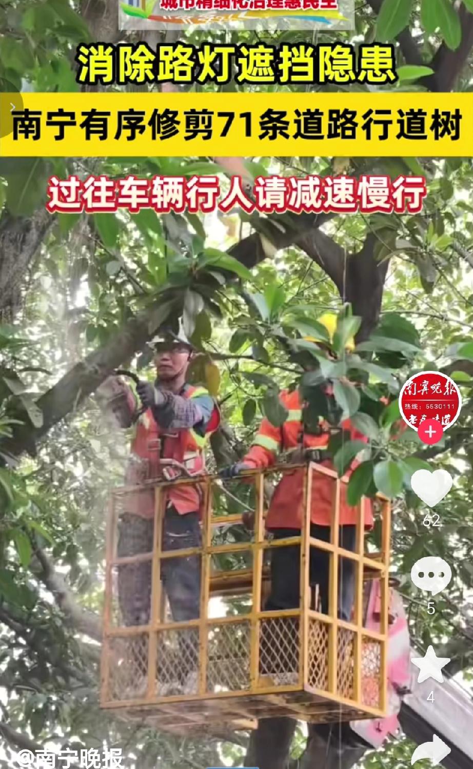 3月23号南宁市对71条道路行道树修剪(消除路灯遮挡)解决树木遮挡路灯、造成夜间照明盲区的安全隐患 覆盖范围:青秀、兴宁、西乡塘、江南、良庆、邕宁6城区共71条道路 已完成修剪(19条)茶花园路、云景路、凤翔路、嘉宾路、葛村路、东葛路、新民路、龙福路、龙祥路、彩虹路、五一路北四里、凤凰路、那黄大道、歌海路、龙堤路、五象大道、金禾路、金宁路、兴东路 , 正在/待修剪(部分)长湖路、江北大道、人民路、望州路、民主路、明秀路、新华路、大学路、龙腾路、鲁班路、友爱路、北湖路、衡阳路、邕武路、秀安路、凤岭南路、松柏路、东沟岭、东州路、安吉大道西一里、秀灵路、安阳路、长兴路、秀田路、金川路 。(来源于@南宁晚报)