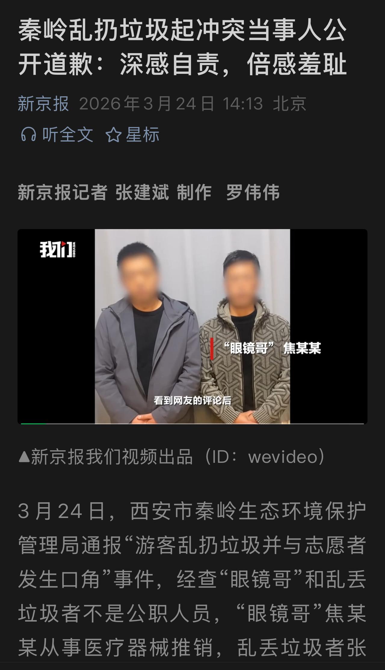 最新进展!秦岭子午峪乱扔垃圾者公开道歉:深感自责,深感耻辱! “眼镜哥”焦某某,某科技公司推销员,扔垃圾者张某某,陕西某超市员工,他们被严肃评判教育,并当面露镜道歉,他们对自己行为感到耻辱,以后不会发生!(图三) 他们看到了网上铺天盖地的批评,认识到自己行为是极端错误的! 长安区城管部门对他们已经进行了处罚! 西安爆料