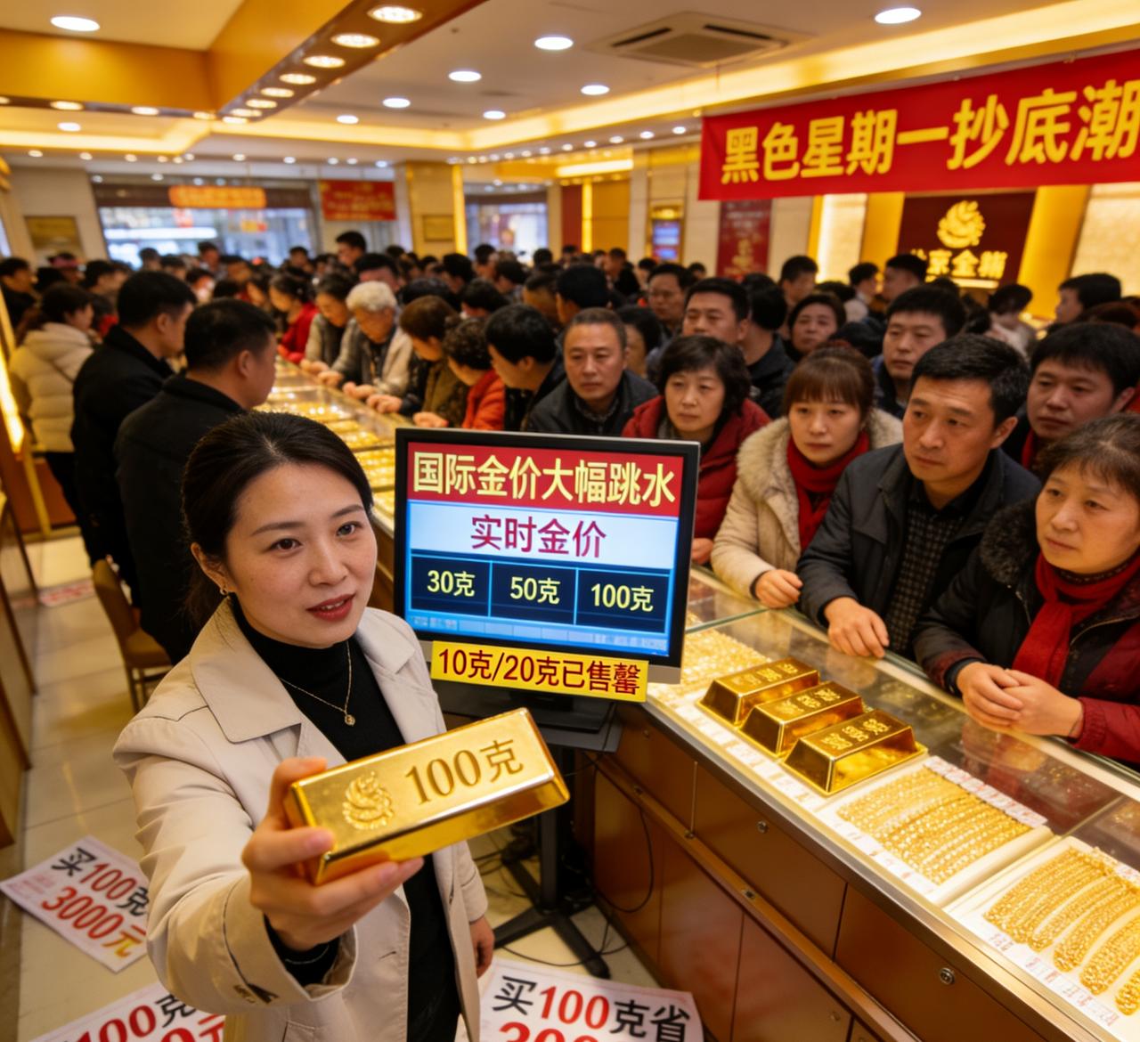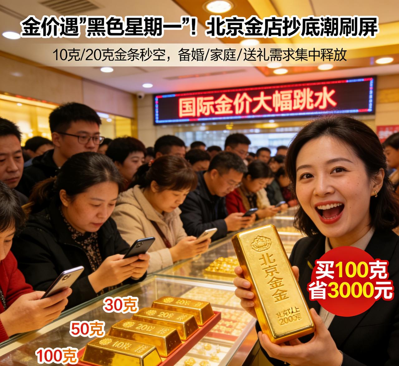 金价遇“黑色星期一”!北京金店抄底潮刷屏,10克/20克金条秒空,女子买100克一顿饭省3000元。 国际金价大幅跳水,国内市场迎来黑色星期一,北京多家金店瞬间被抄底人流挤满,投资金条遭疯抢,小克重规格快速断货,现场火爆程度堪比节假日。 本轮金价回调,国际金价与沪金期货同步走弱,国内基础金价、品牌金饰价全线回落,投资金条价格同步下探,给刚需与囤金客送上“降价窗口”。在北京菜百等主流金店,投资金条柜台前里三层外三层,消费者紧盯实时报价果断出手,10克、20克小规格金条当天即售罄,门店仅能提供30克、50克、100克及以上规格。 一位到场购金的女士直言,自己果断入手100克投资金条,前后不过吃顿饭的时间,按当日价差计算,直接省下3000元,性价比拉满。备婚三金、家庭配置、送礼囤货等需求集中释放,不少顾客表示“跌了就是机会,先锁仓再说”。 业内人士分析,此次金价回落受海外货币政策预期、资金获利了结等多重因素影响,短期波动加大。对普通投资者而言,小克重、刚需型购金更稳妥,盲目追低、加杠杆抄底仍需谨慎。 一边是市场波动,一边是实物抢空,这轮“黑色星期一”,意外点燃了普通人的黄金配置热情。金价下一步怎么走,抄底是机会还是风险,市场仍在密切观望。金价回收行情 投资金价 贵金属金价 伦敦金价 黄金预购价 2月金价 上海交易所金价