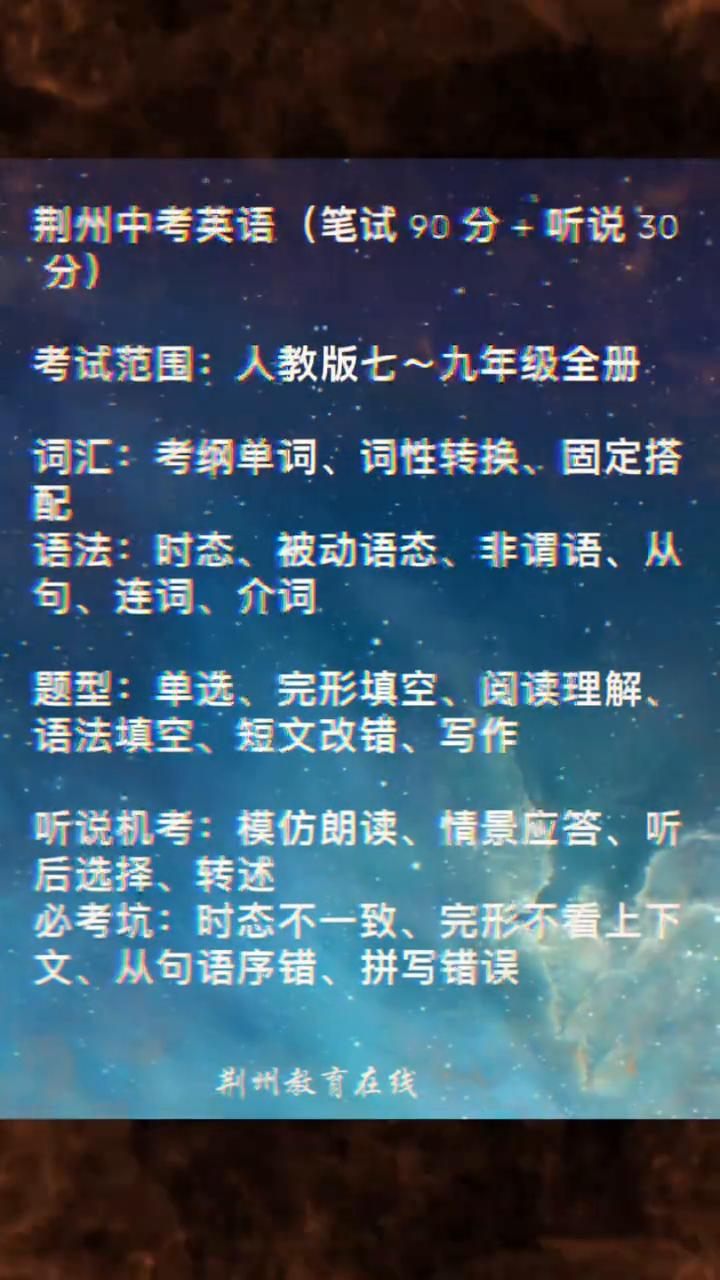 荆州中考英语(笔试90分+听说30分)。 考试范围:人教版七~九年级全册。 词汇:考纲单词、词性转换、固定搭配。 语法:时态、被动语态、非谓语、从句、连词、介词。 题型:单选、完形填空、阅读理解、语法填空、短文改错、写作。 听说机考:模仿朗读、情景应答、听后选择、转述。 必考坑:时态不一致、完形不看上下文、从句语序错、拼写错误。
