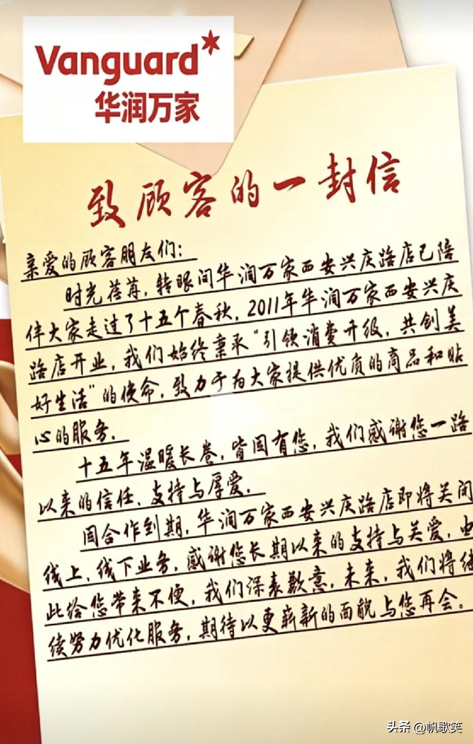 重磅!最新消息!西安一开业超15年的知名商超官宣将于月底闭店… 近日,一则来自“华润万家陕西”的《致顾客的一封信》在西安市民的朋友圈里悄然传开。 信中提到,因合作到期,华润万家西安兴庆路店即将关闭线上、线下全部业务。这意味着,这家陪伴了西安东郊居民整整15年的老牌大卖场,即将正式与我们告别。 据悉,华润万家兴庆路店于2011年开业,是交大商圈内重要的生活补给站。十五年来,从柴米油盐到日用百货,从新鲜果蔬到节日年货,它承载了无数家庭的日常采买记忆,也见证了周边社区的变迁与发展。 对于此次闭店,华润万家在信中表达了对顾客长期支持的感谢,并对带来的不便表示歉意。门店从3月24日至31日正在进行清仓活动。 持有华润万家会员卡、购物卡的顾客也无需担心,卡片可以继续在就近的韩森路店、雁塔路店、太乙路店、朝阳国际店等门店使用。 近年来,传统商超面临转型挑战,华润万家也在积极进行门店调改升级,以全新的面貌适应市场变化。兴庆路店的关闭,是一个时代的句点,或许也预示着新的开始。 十五年,足以让一个孩童长大成人。感谢兴庆路店曾经的陪伴,它不仅是超市,更是一段关于城市与生活的温暖记忆…