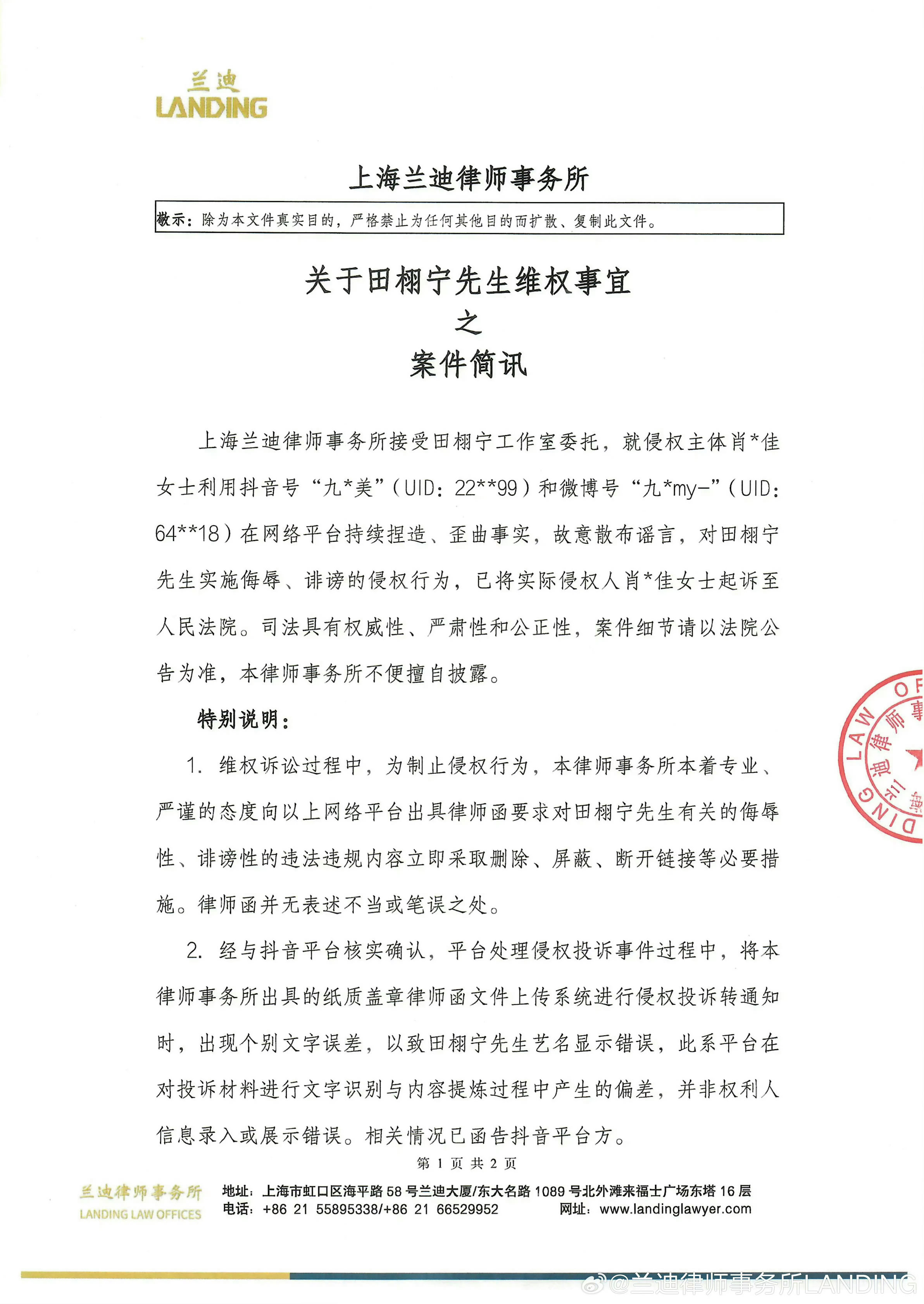 律所发布田栩宁维权案件简讯 并说田栩宁视频投诉的错别字,是抖音平台打字错误